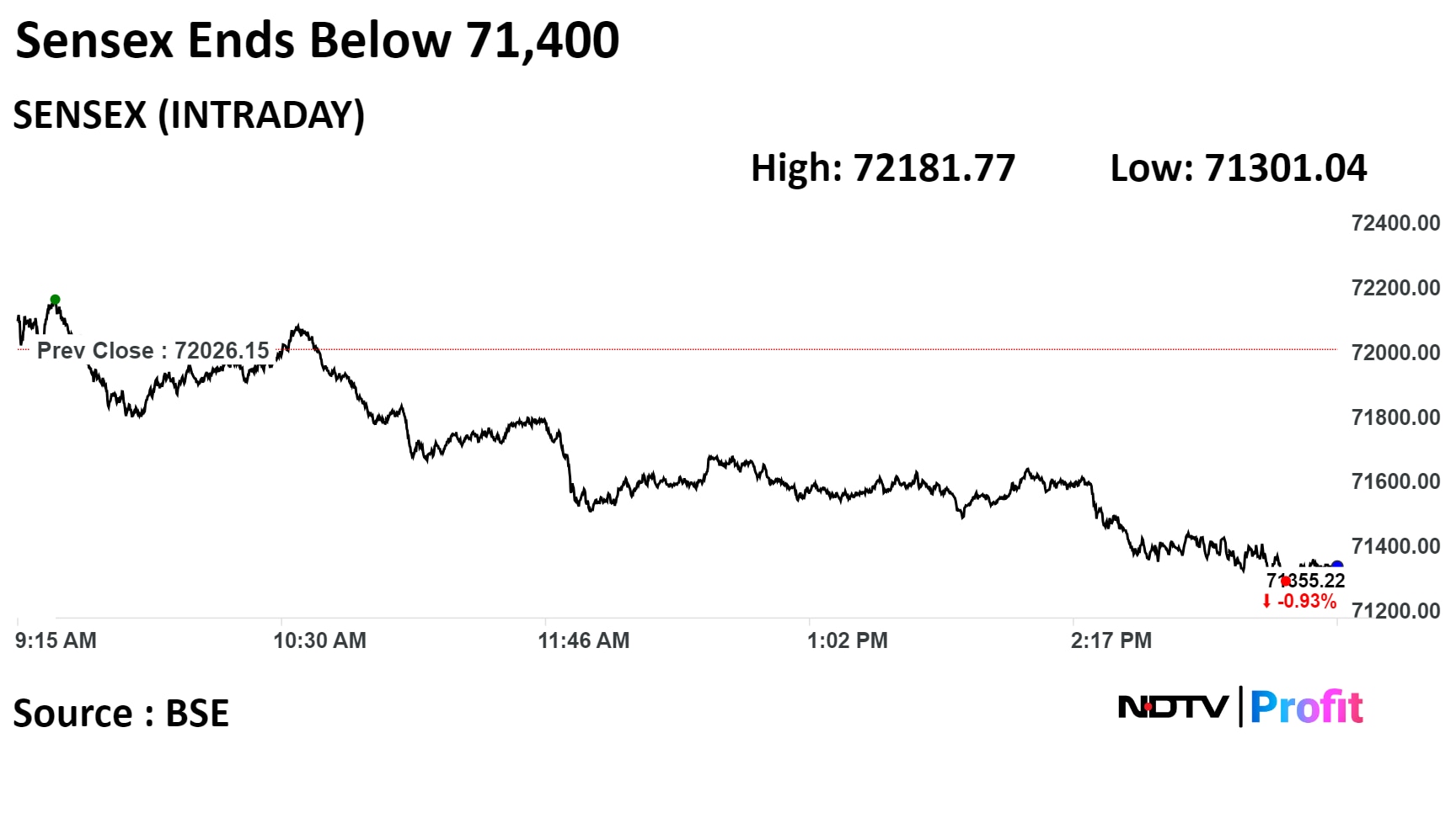 The Nifty ended 197.80 points, or 0.91%, lower at 21,513.00 points, while Sensex fell 670.93 points, or 0.93%, to close at 71,355.22. Nifty hit an intraday low of 21,492.90, and the Sensex fell to 71,301.04.