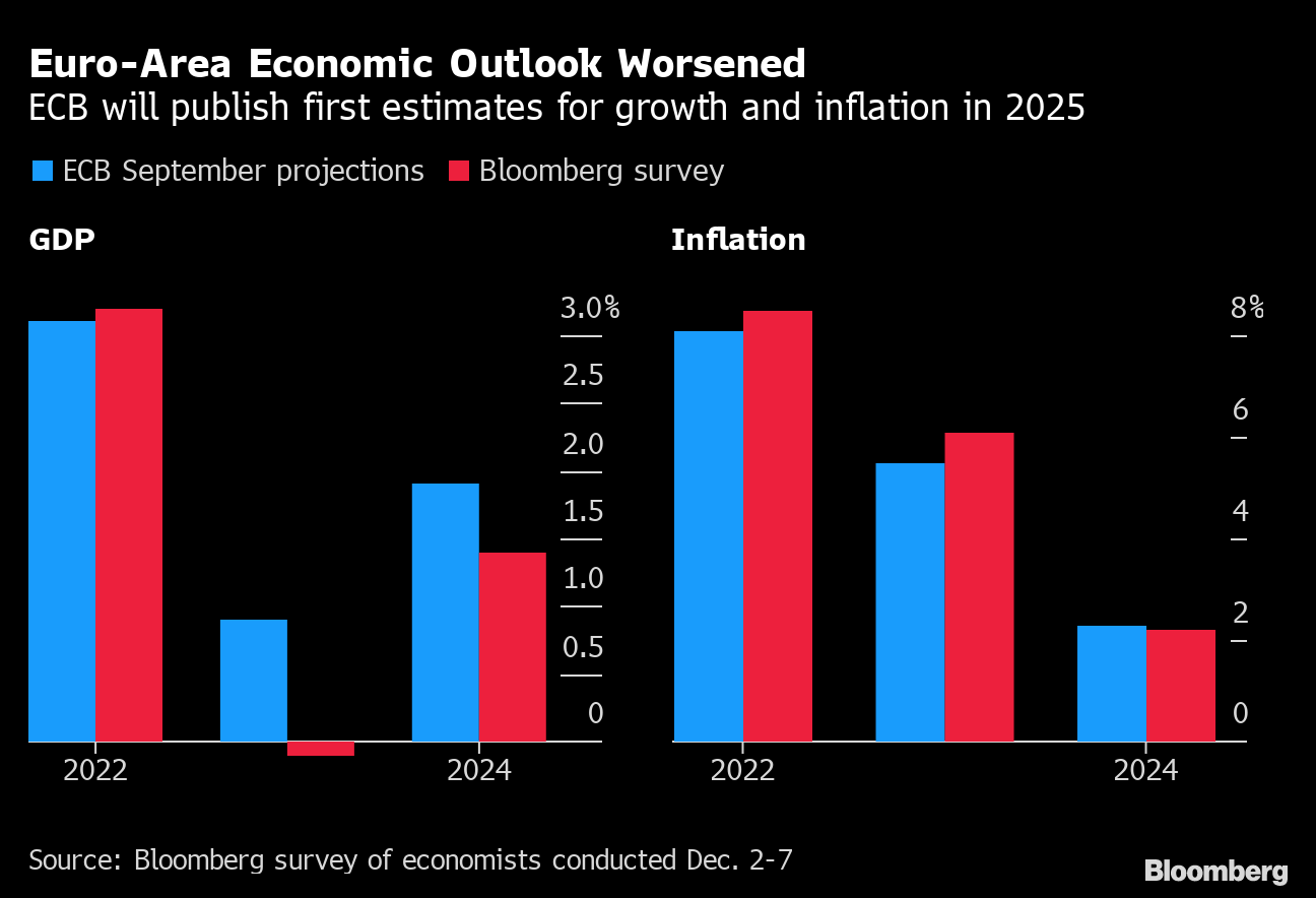 The ECB will probably hike rates by 50 basis points, after inflation in the euro area slowed for the first time in 1 1/2 years last month. Yet with consumer-price growth still at 10%, a third consecutive 75 basis-point move can't be completely excluded and some of the more hawkish rate setters have suggested they'd back such a step. The Governing Council's decision will also be influenced by new quarterly economic forecasts, which will likely see a downgrade in growth and upgrade in inflation projections for 2023.