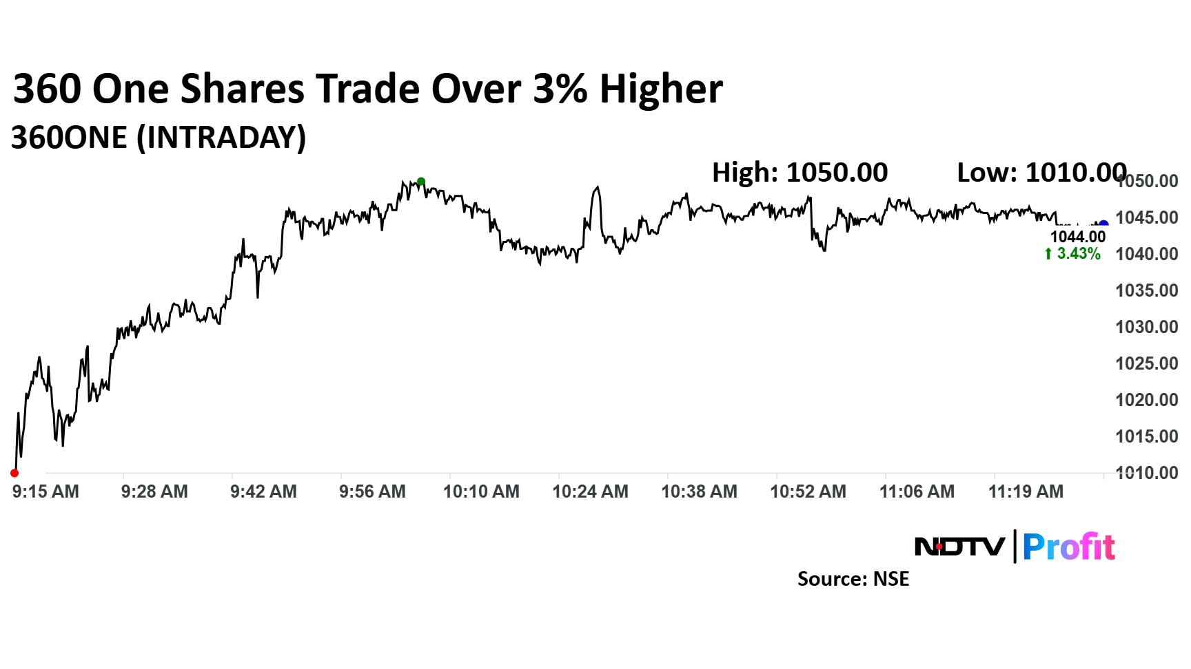 360 One stock rose as much as 4.02% during the day to Rs 1,050 apiece on the NSE. It was trading 3.42% higher at Rs 1,043.15 apiece, compared to an 0.2% advance in the benchmark Nifty 50 as of 11:33 a.m.