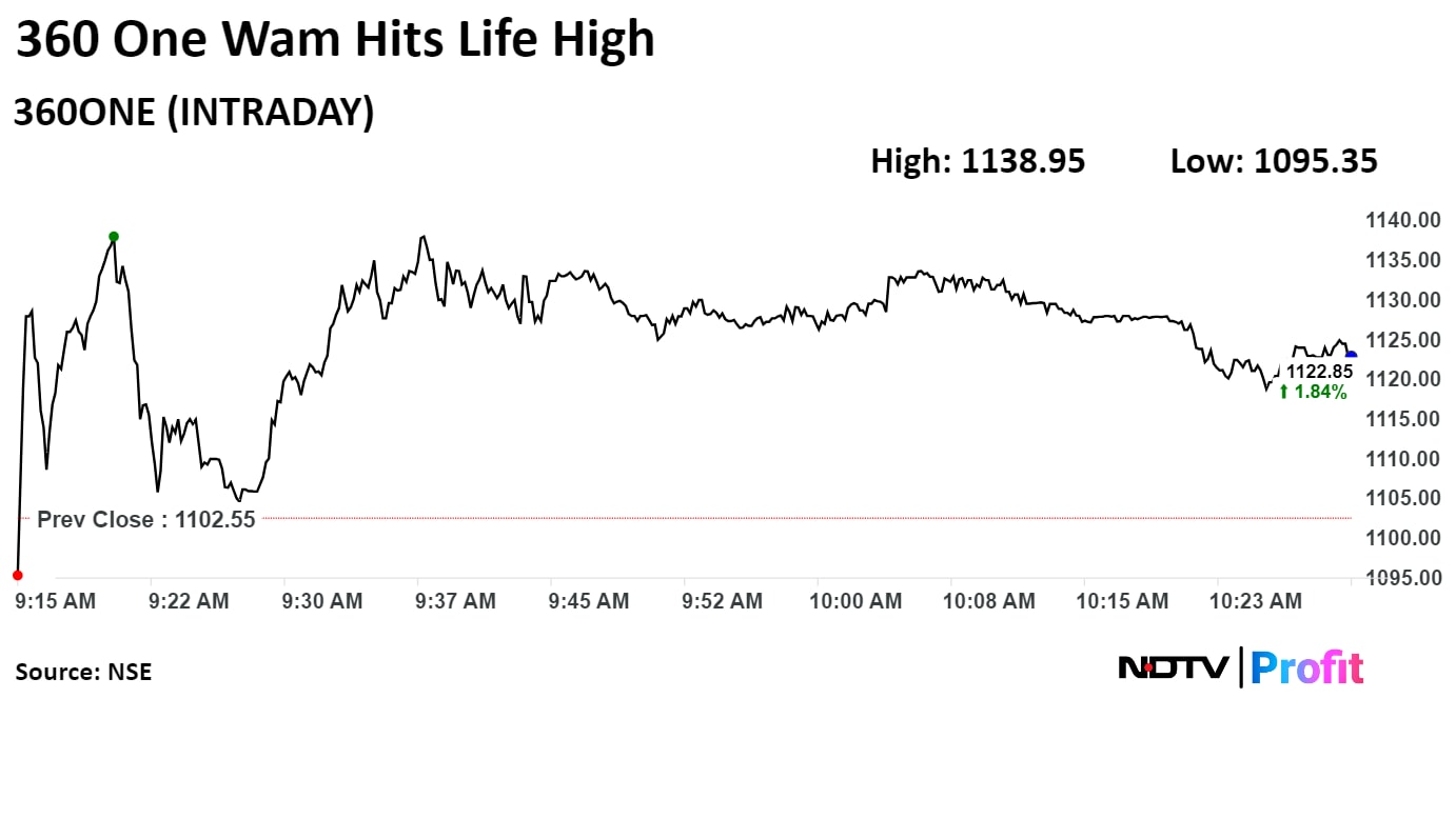 Shares of 360 One Wam rose as much as 3.30% to Rs 1,138.95, the highest level since its listing on Sept. 19, 2019. It was trading 1.52% higher at Rs 1,119.35 as of 10:42 a.m., compared to 0.35% advance in the NSE Nifty 50 index.