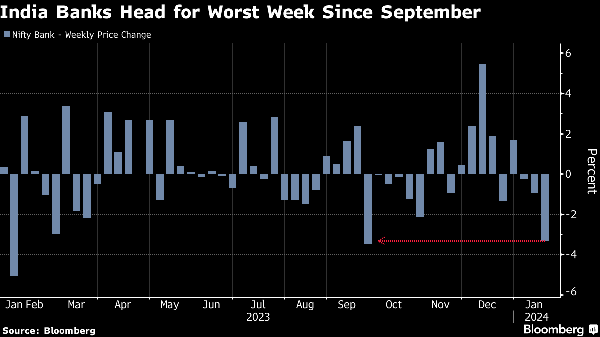 A gauge of the country's top 12 largest banks is set for its worst week since September, erasing nearly $21 billion in market value through Thursday's close. Two thirds of that bruising loss came from HDFC Bank, whose quarterly numbers showed falling net interest margins and weaker deposit growth.