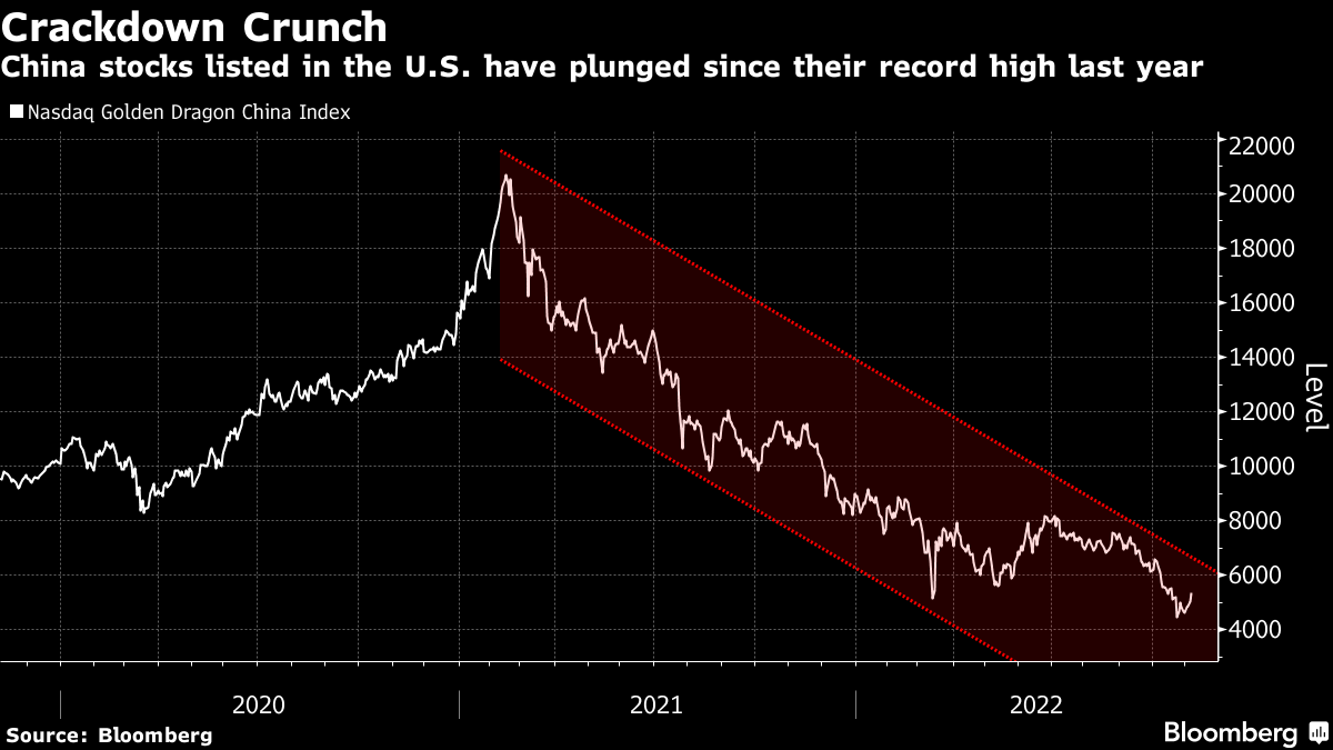 A threat to delist Chinese stocks that trade on US exchanges but don't comply with Trump-era audit laws has backing from both Democrats and Republicans. That support, as well as growing geopolitical tension surrounding China, has sent the Nasdaq Golden Dragon China Index plunging about 40% this year.