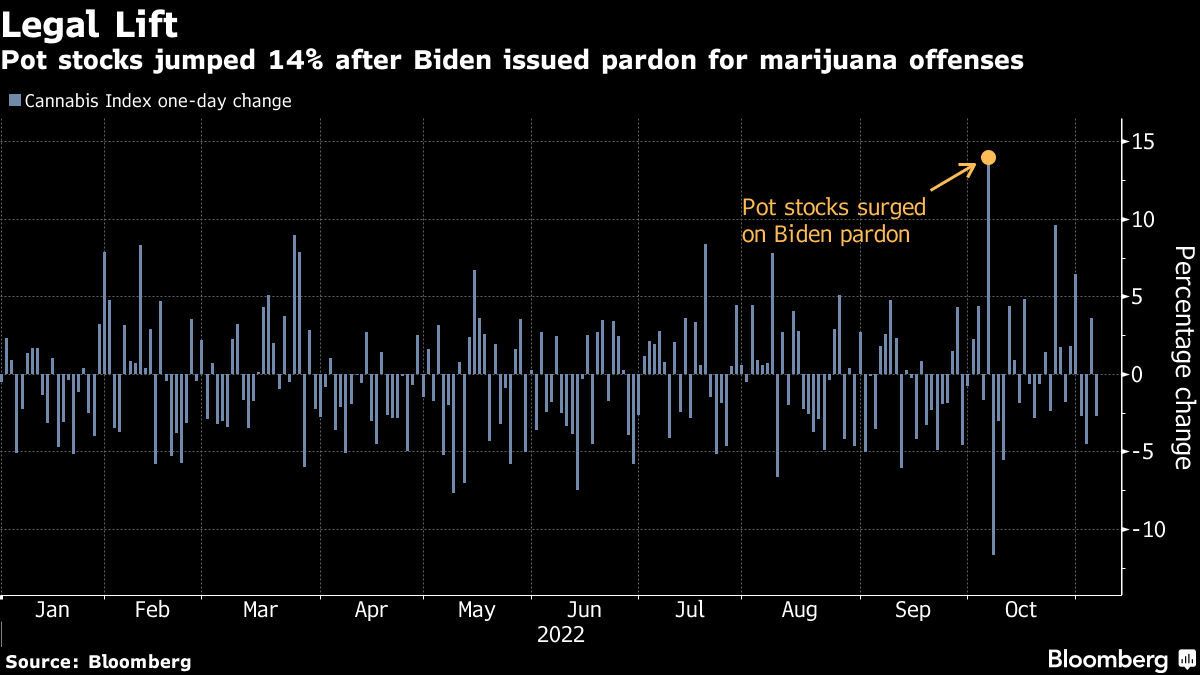 The cannabis sector has been hit hard this past year amid the fitful pace of US legalization and a broader risk-off mood among investors in the highly speculative industry. The Cannabis Index has plunged 57% in 2022, with Tilray Brands Inc., Canopy Growth Corp. and SNDL Inc. all sinking at least 46% each.