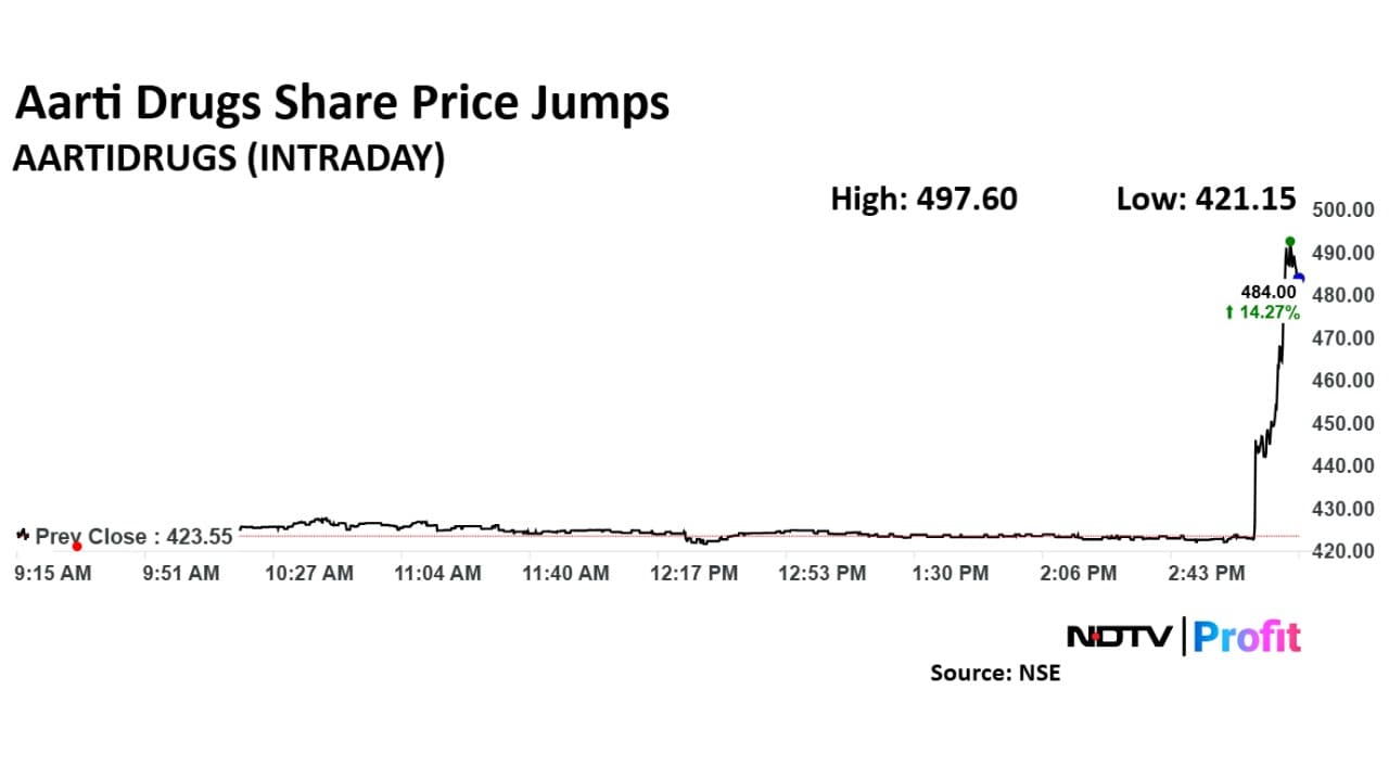 Shares of Aarti Drugs rose as much as 17.48% to Rs 497.6 apiece, the highest level since November 7. It pared gains to close 12.4% higher at Rs 475.90 apiece. This compares to a 0.1% decline in the NSE Nifty 50 Index.
