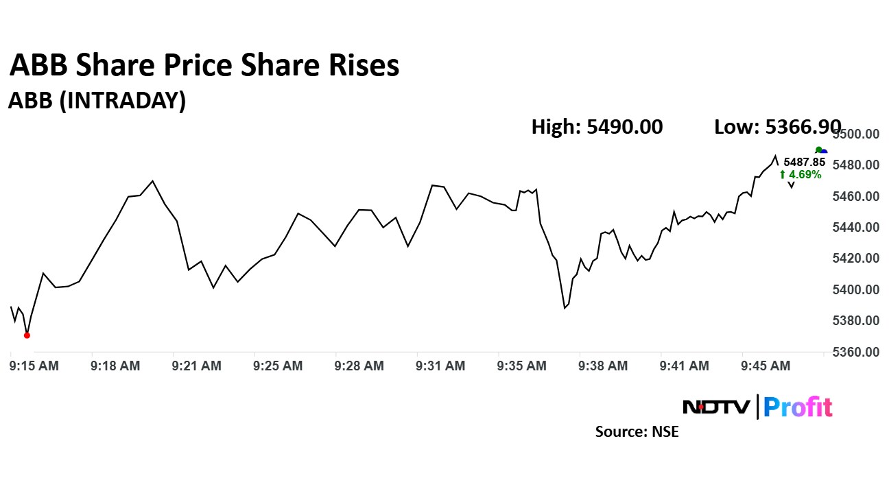 ABB India share price rose 4.62% to Rs 5,492.00 apiece, the highest level since Feb. 14. The share price rose 4.36% to Rs 5,470.45 apiece as of 9:56 a.m., as compared to a 0.21% decline in the NSE Nifty 50.