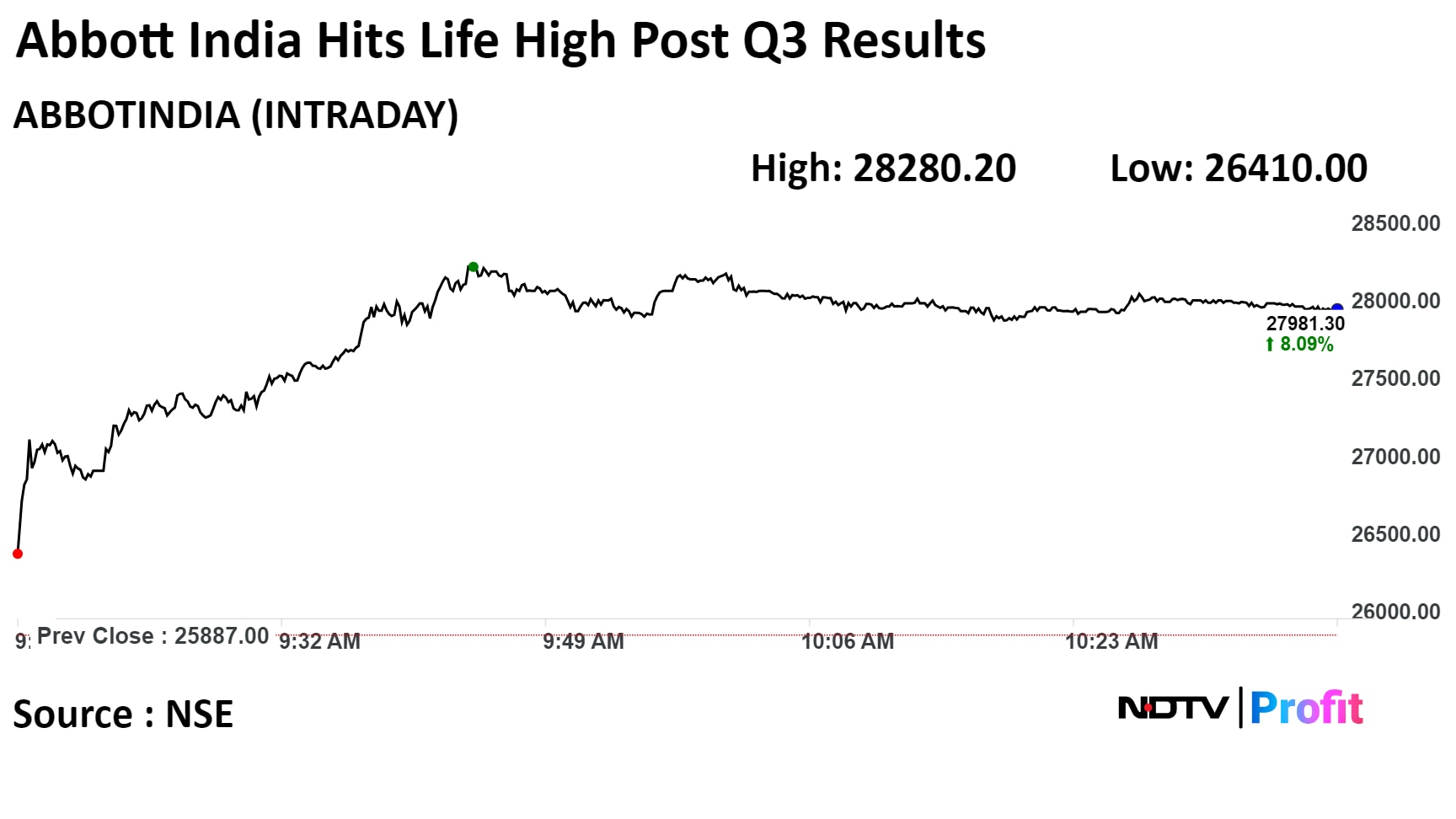 Shares of Abbott India Ltd. surged over 9% to an all-time high on Friday after its third-quarter profit jumped beating analysts' estimates.