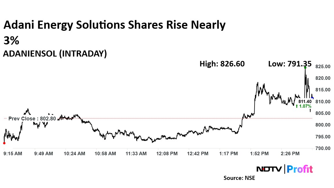 The shares of Adani Energy Solution rose nearly 3% to Rs 826.60 per share. It pared gains to trade 1.45% higher at Rs 814.45 apiece, as of 3:00 p.m. This compares to a 0.25% advance in the NSE Nifty 50 Index.