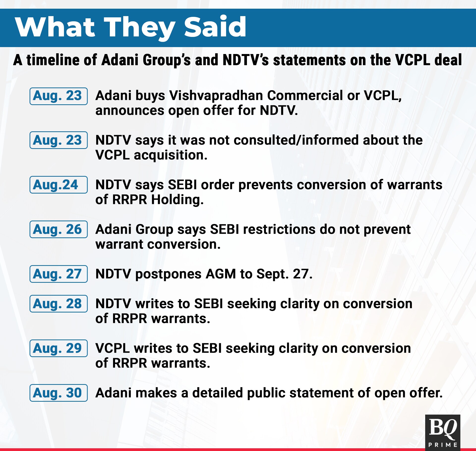 The Adani Group announced the open offer on Aug. 23 with the acquisition of Vishvapradhan Commercial that triggered the takeover code. But NDTV promoters, in disclosures to exchanges, have claimed they were taken unaware and cited a SEBI order as reason against conversion of warrants.