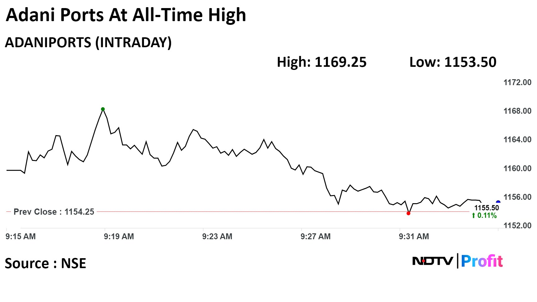 Shares of Adani Ports was trading 0.29% higher at Rs 1,157.65 apiece, compared to a 0.03% advance in the benchmark Nifty 50 as of 9:33 a.m. The stock rose as much as 1.30% during the day to Rs 1,169.25 to hit a life high.