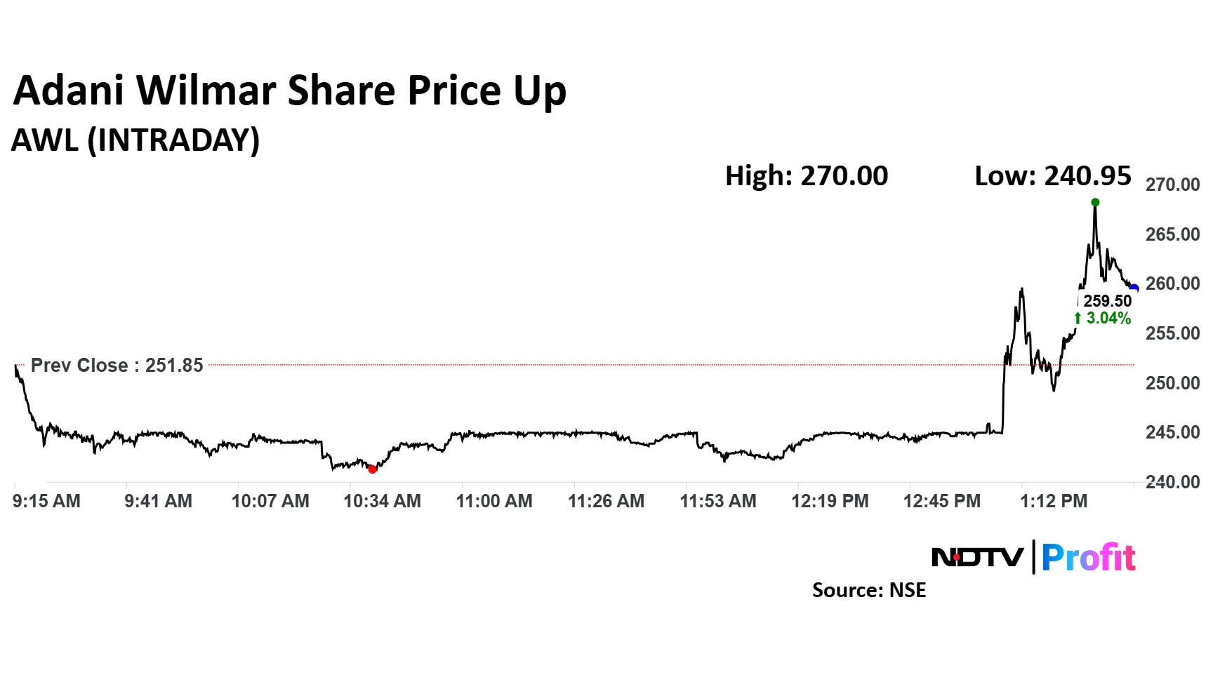 Adani Wilmar share price advanced over 7.2% intraday to Rs 270 apiece. The scrip was trading 3% higher by 1:35 p.m. The benchmark NSE Nifty 50 was down 1.1%.