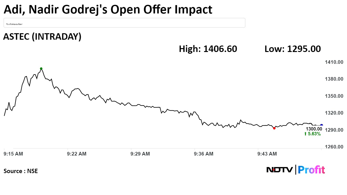 Astec LifeSciences Ltd., causing the shares of the chemical manufacturer to rally. Nadir Godrej is leading the offer to buy more than 50.99 lakh shares at a price of Rs 1,069.75 per share, aggregating to Rs 545.5 crore, the company told the exchanges on Thursday. This is at a discount of 17% to the last closing price of the stock.