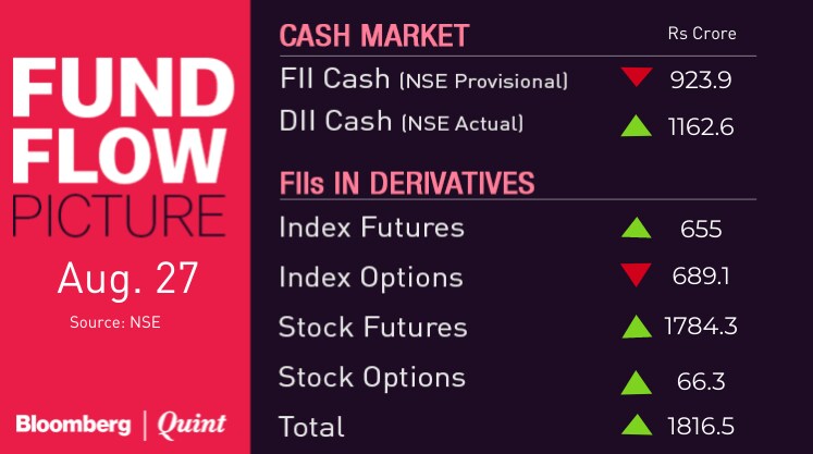 - Bank Nifty Aug futures closed at 28,116.5, discount of 9.5 points versus 29.8 points.