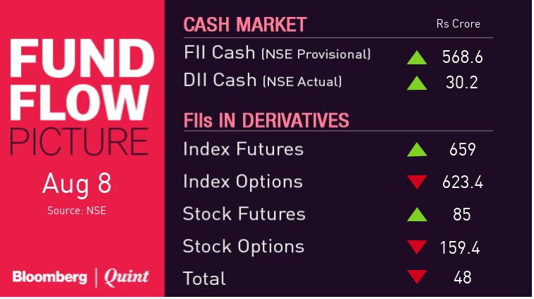 - August series: Nifty open interest up 3 percent; Bank Nifty open interest down 2 percent.