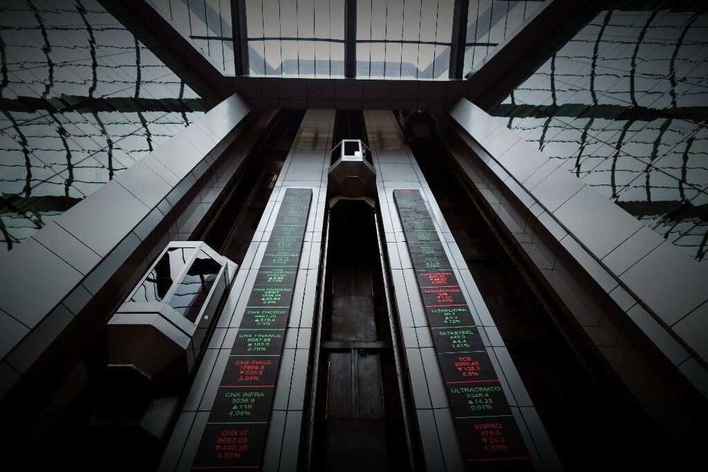 Electronic ticker boards indicate the latest stock figures inside the atrium at the National Stock Exchange (NSE) in Mumbai, India (Photographer: Dhiraj Singh/Bloomberg)