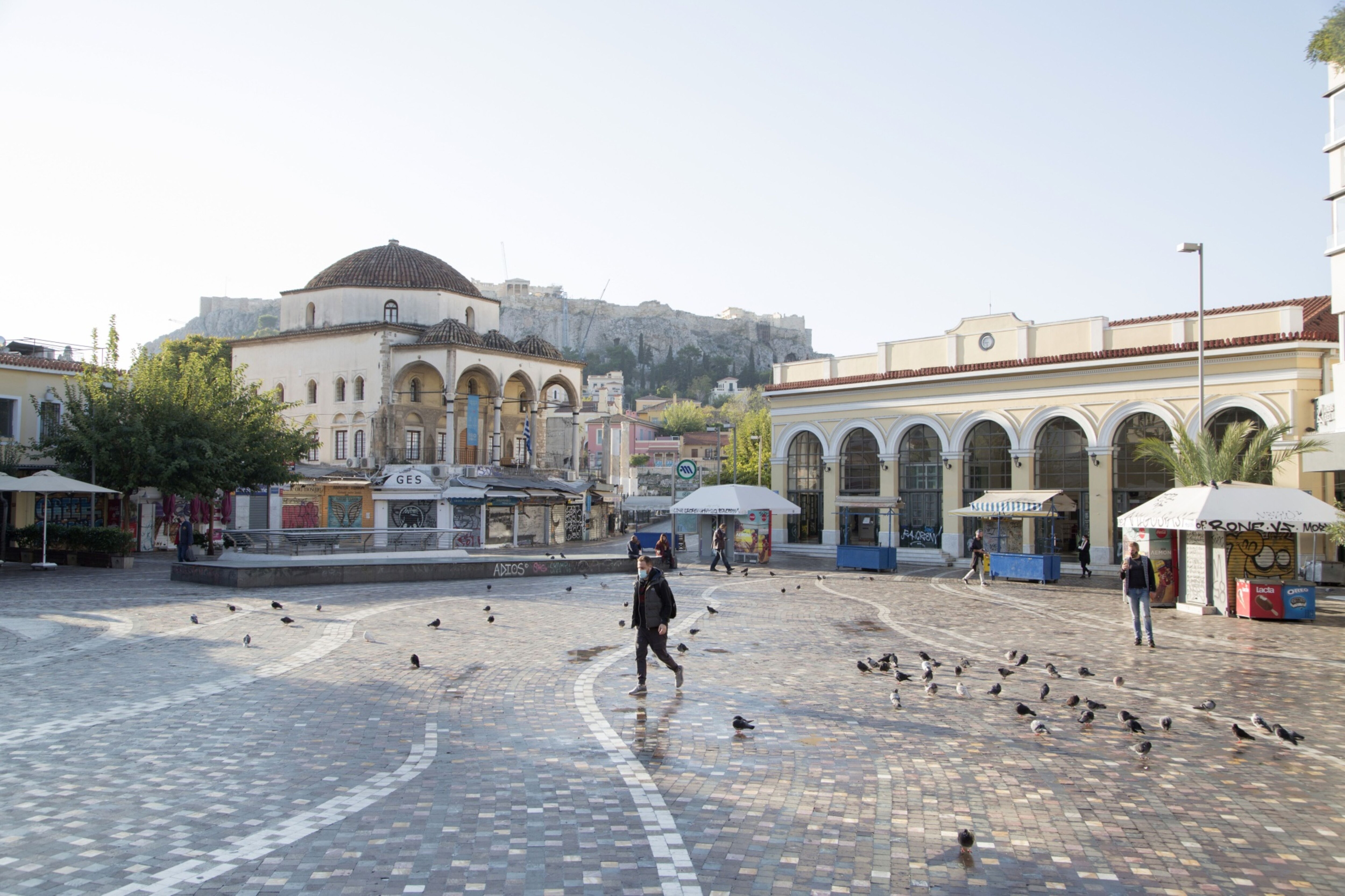 An empty Monastiraki square during lockdown in Athens, Greece. (Photographer: Loulou D’Aki/Bloomberg)