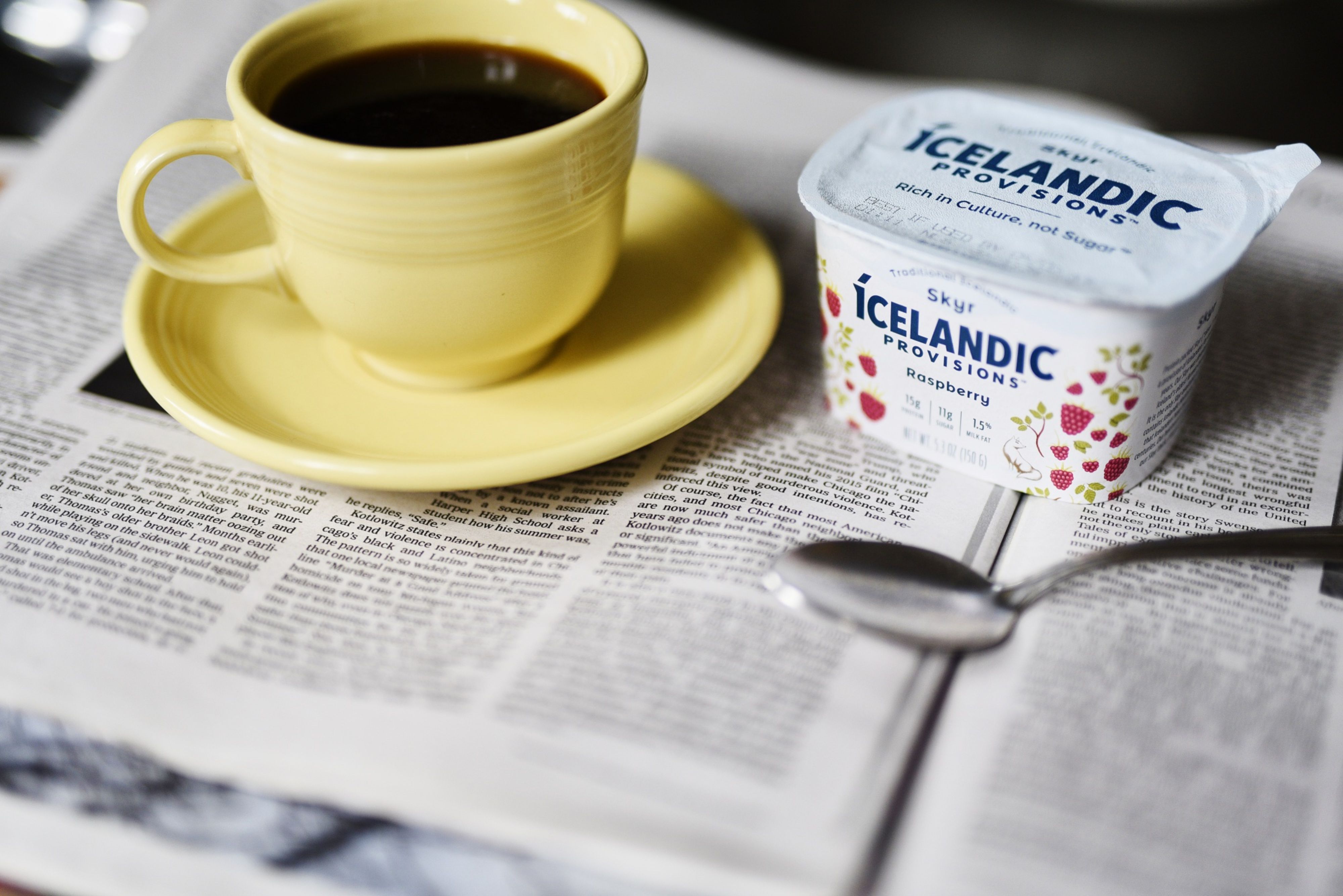 A container of Icelandic Provisions Skyr raspberry yogurt with coffee. [Photographer: Gabby Jones/Bloomberg]
