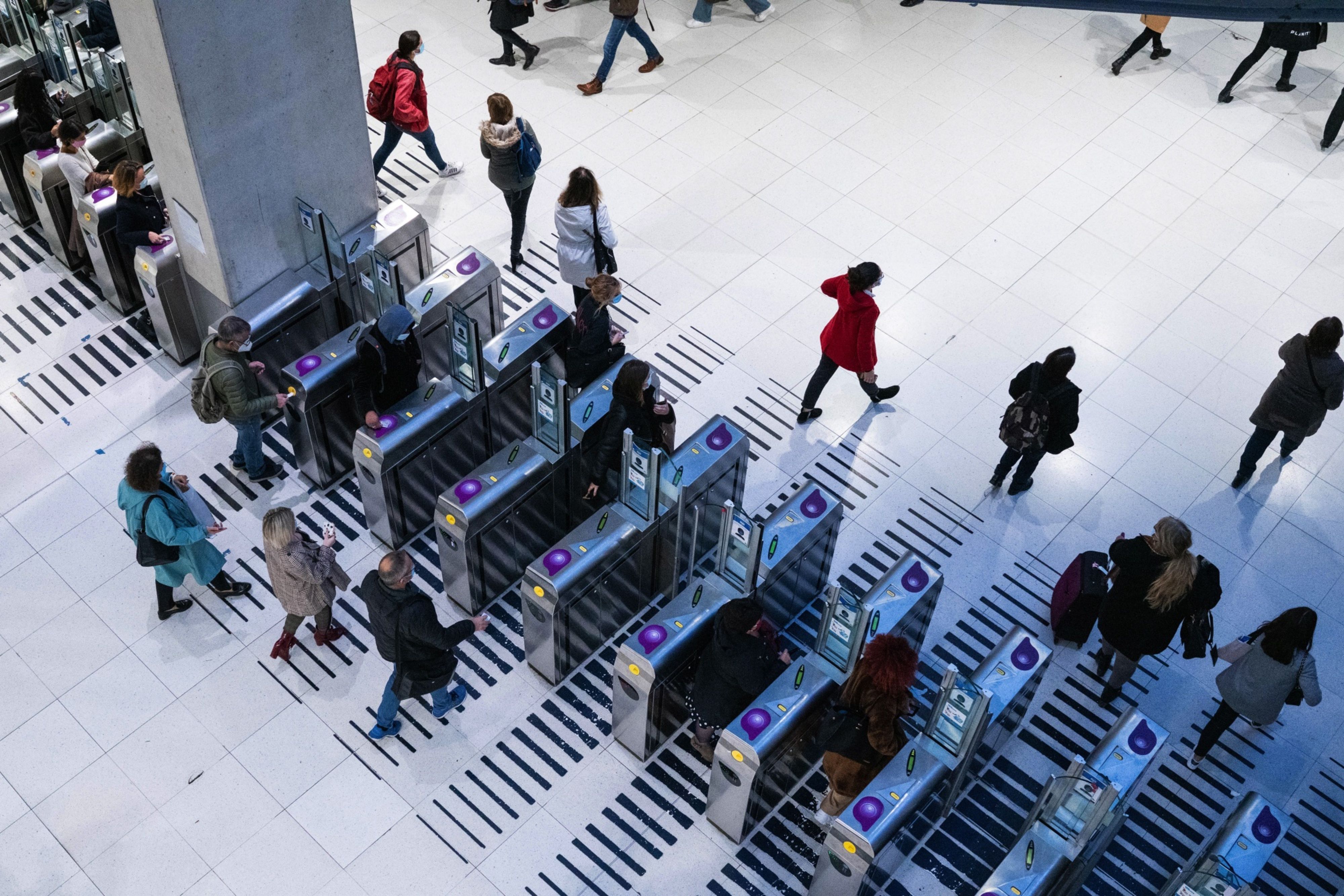 Rush hour morning commuters pass through ticket barriers at Gare du Nord railway station in Paris. (Photographer: Benjamin Girette/Bloomberg)