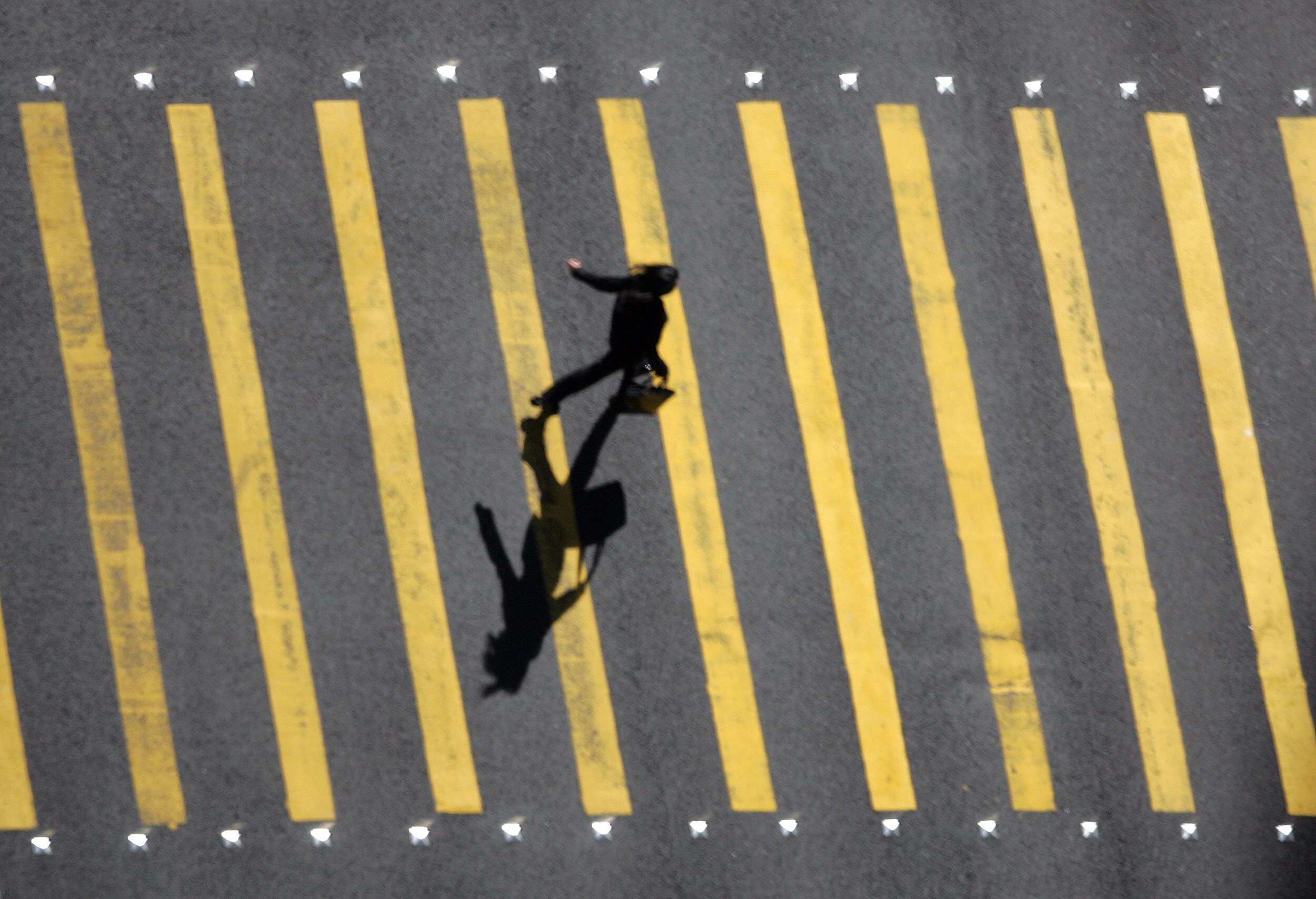 A woman running across a pedestrian crosswalk in downtown Hong Kong, China casts a late-afternoon shadow (Photographer: Dennis Owen/Bloomberg News)