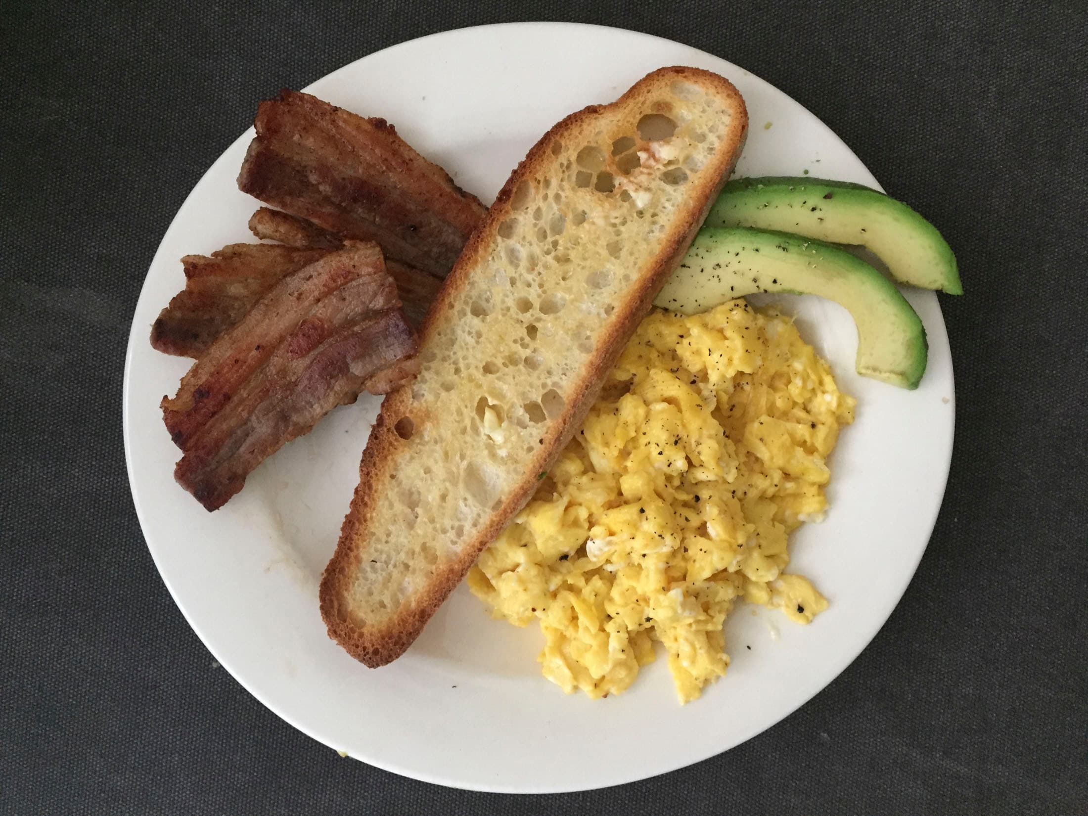 A breakfast plate with bacon, bread and scrambled eggs. (Photographer: Kate Krader/Bloomberg)