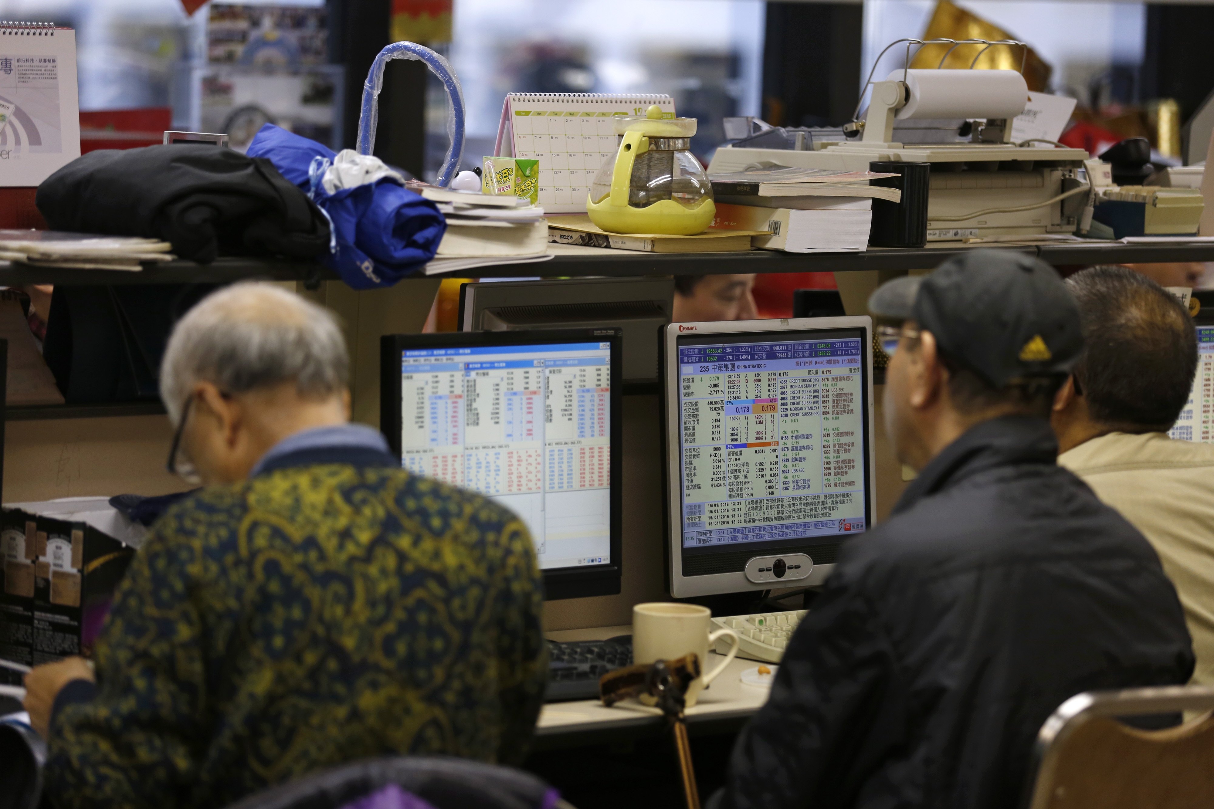Investors look at stock information on computer screens at a securities brokerage in Hong Kong, China (Photographer: Justin Chin/Bloomberg)