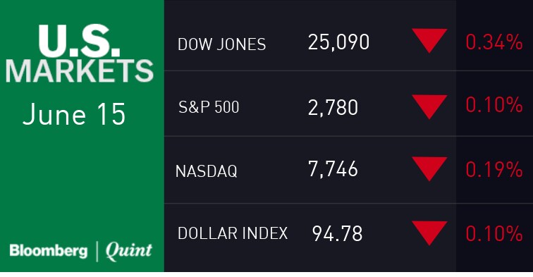 • Stocks fell on the final day of a week that included the U.S.-North Korea summit, major central bank meetings and escalating trade tensions between Washington and Beijing.