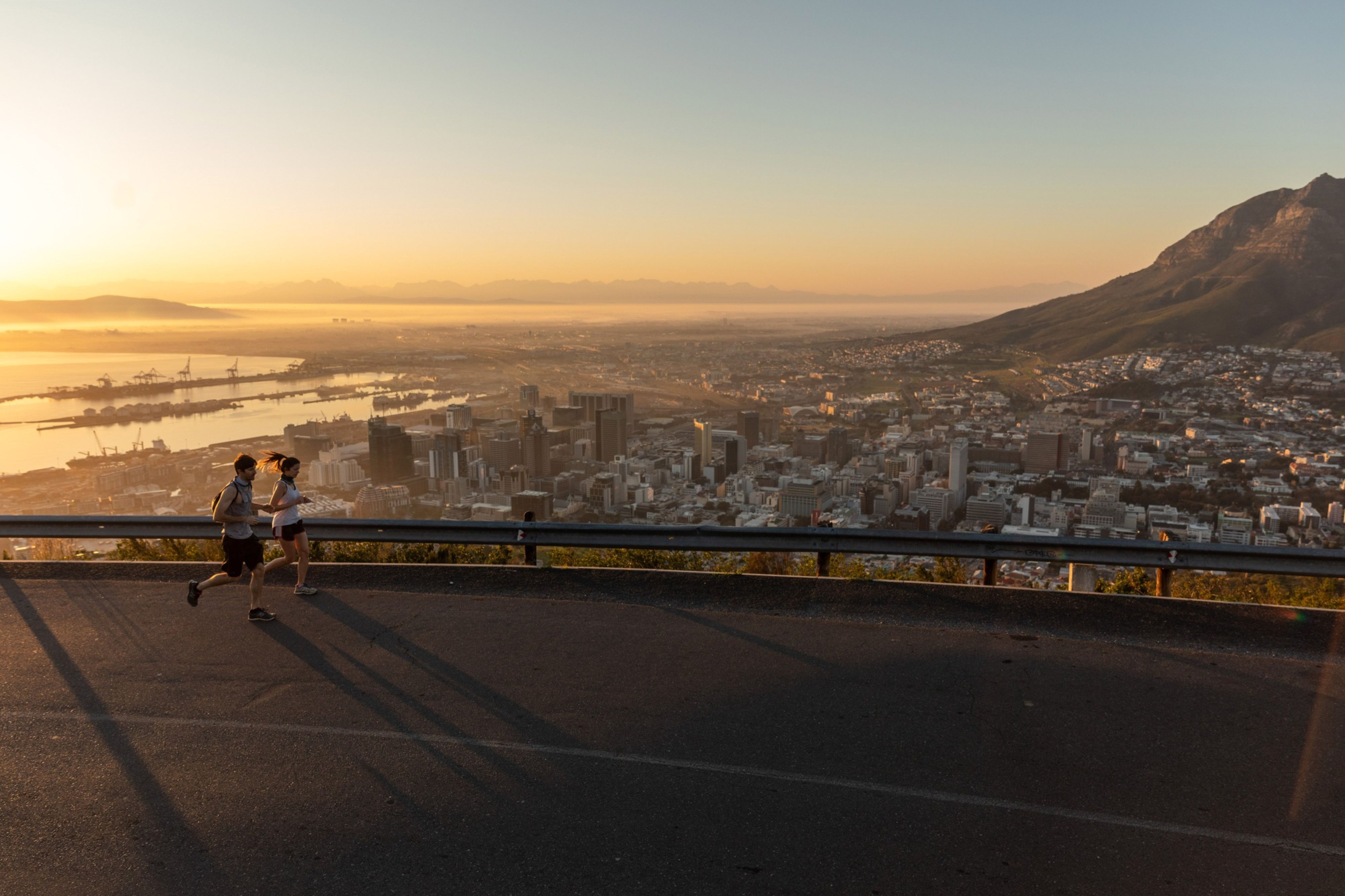 Joggers make their way up a hill as the port area and commercial high-rise properties stand at the foot of Table mountain as the sun rises in Cape Town, South Africa. (Photographer: Dwayne Senior/Bloomberg)