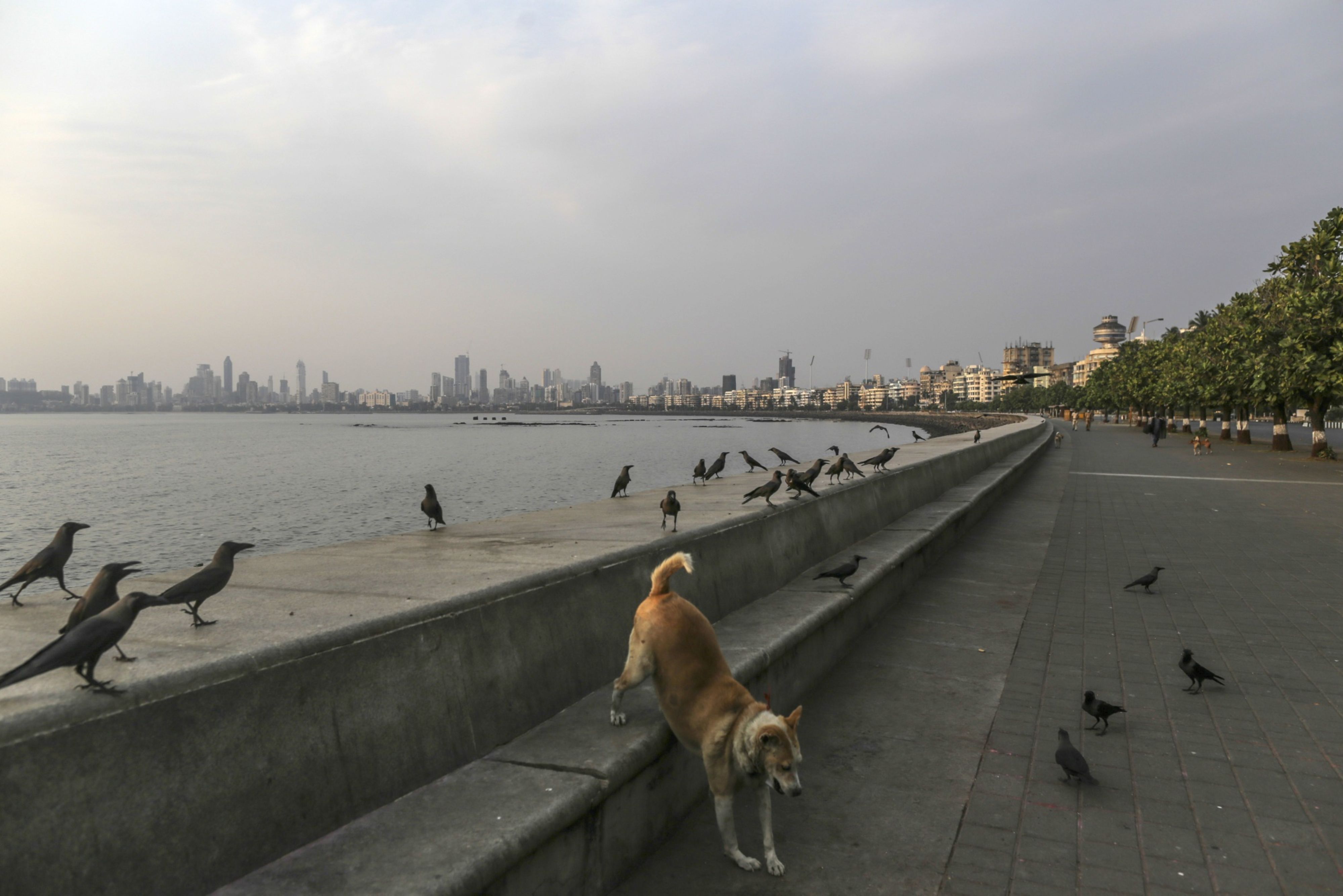 A dog stands with crows on the near-empty Marine Drive during a lockdown imposed due to the coronavirus in Mumbai, India. (Photographer: Dhiraj Singh/Bloomberg)