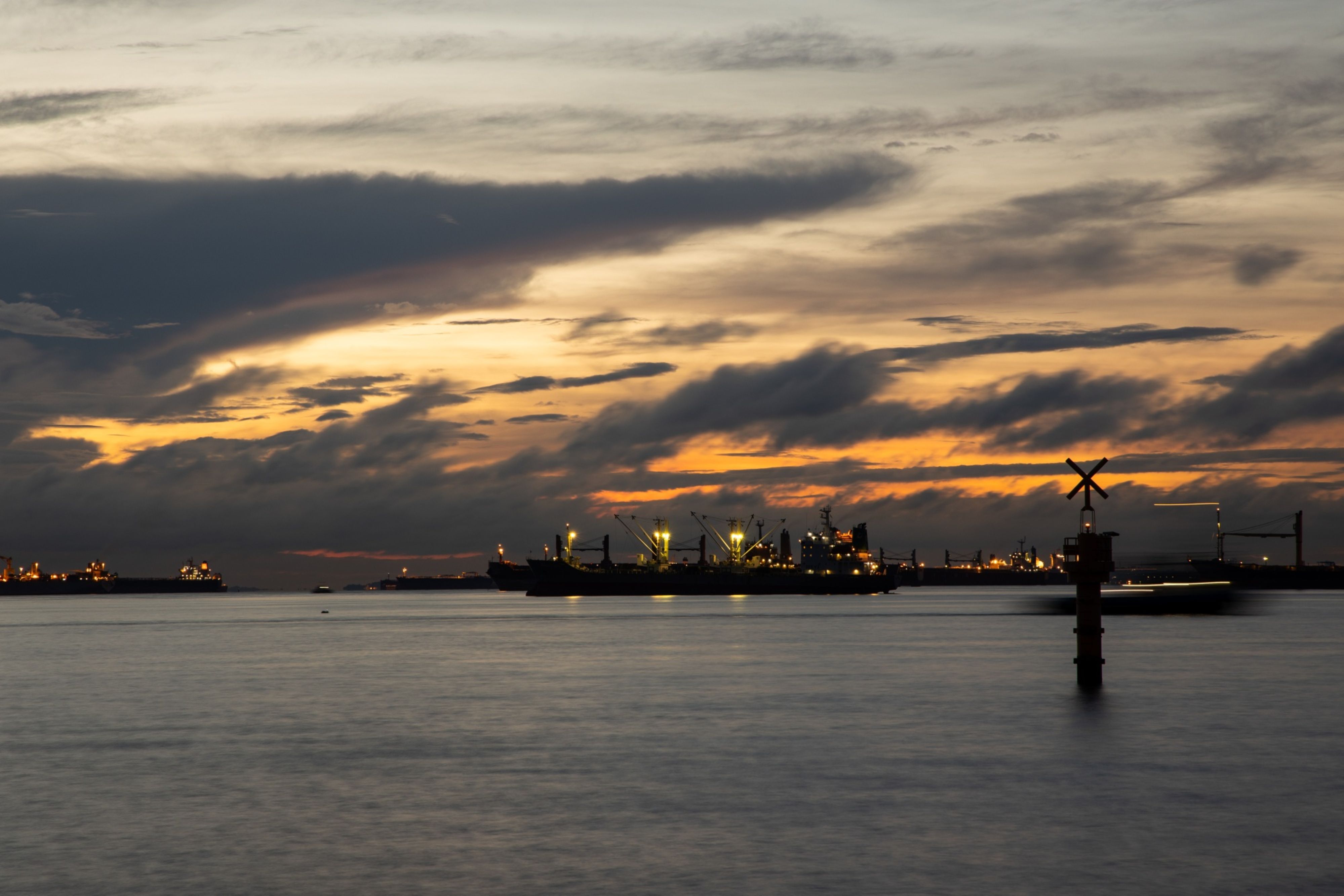 Cargo ships sit moored at sunrise in Singapore, Singapore. (Photographer: SeongJoon Cho/Bloomberg)