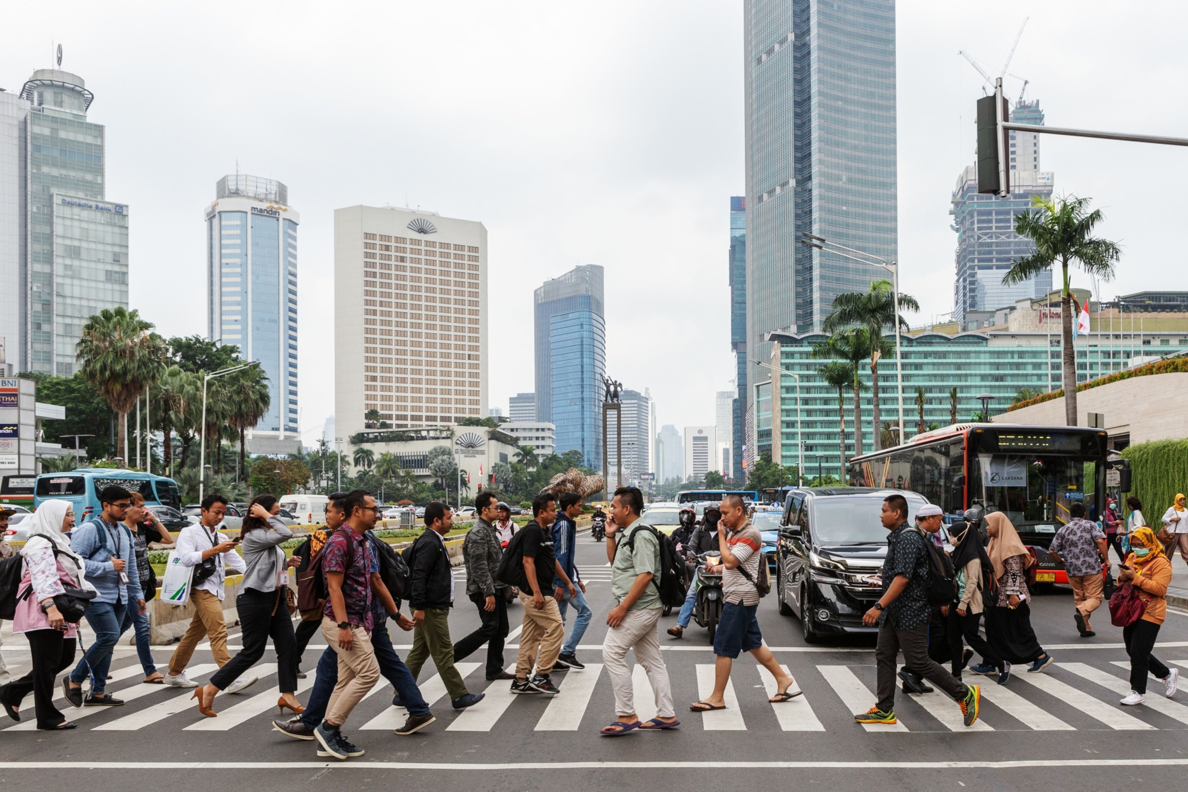 Pedestrians cross a road in Jakarta, Indonesia. (Photographer: Muhammad Fadli/Bloomberg)