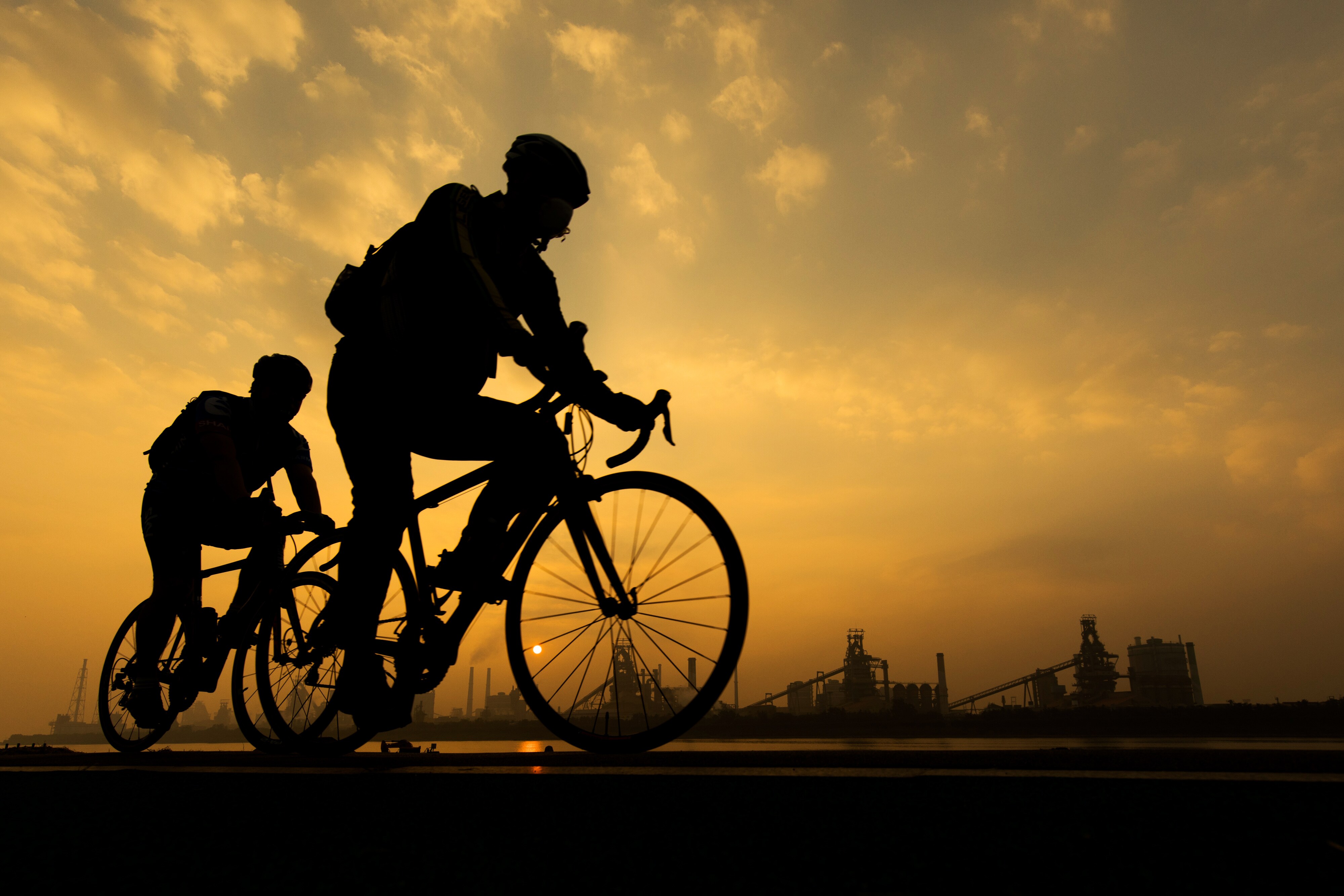 People are silhouetted as they ride bicycles past a Posco steel mill at sunrise in Pohang, South Korea. (Photographer: SeongJoon Cho/Bloomberg)