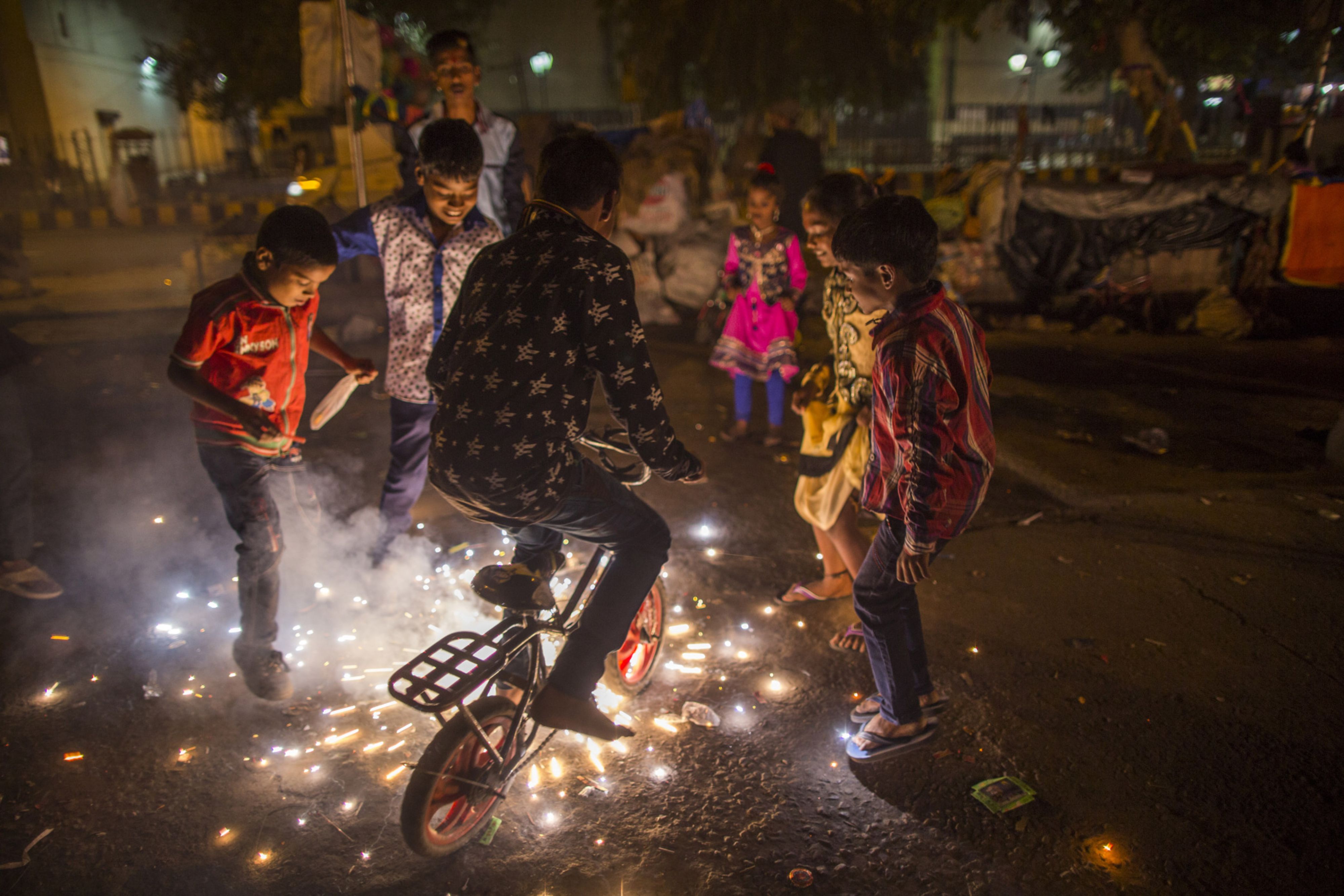 Children light fireworks during Diwali celebrations in Delhi, India (Photographer: Prashanth Vishwanathan/Bloomberg)