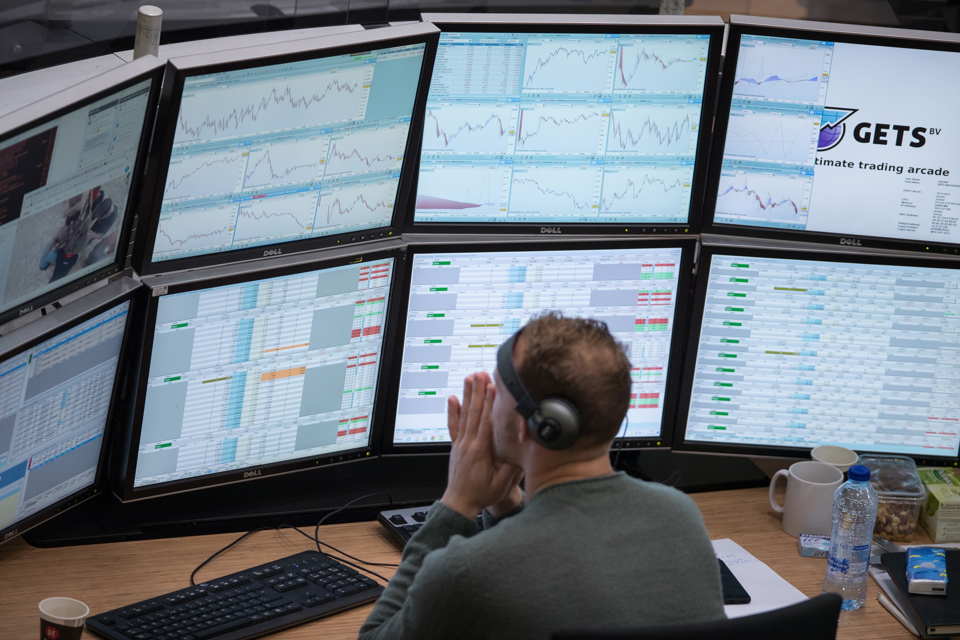 A financial trader monitors data on computer screens on the trading floor inside a stock exchange. (Photographer: Jasper Juinen/Bloomberg)