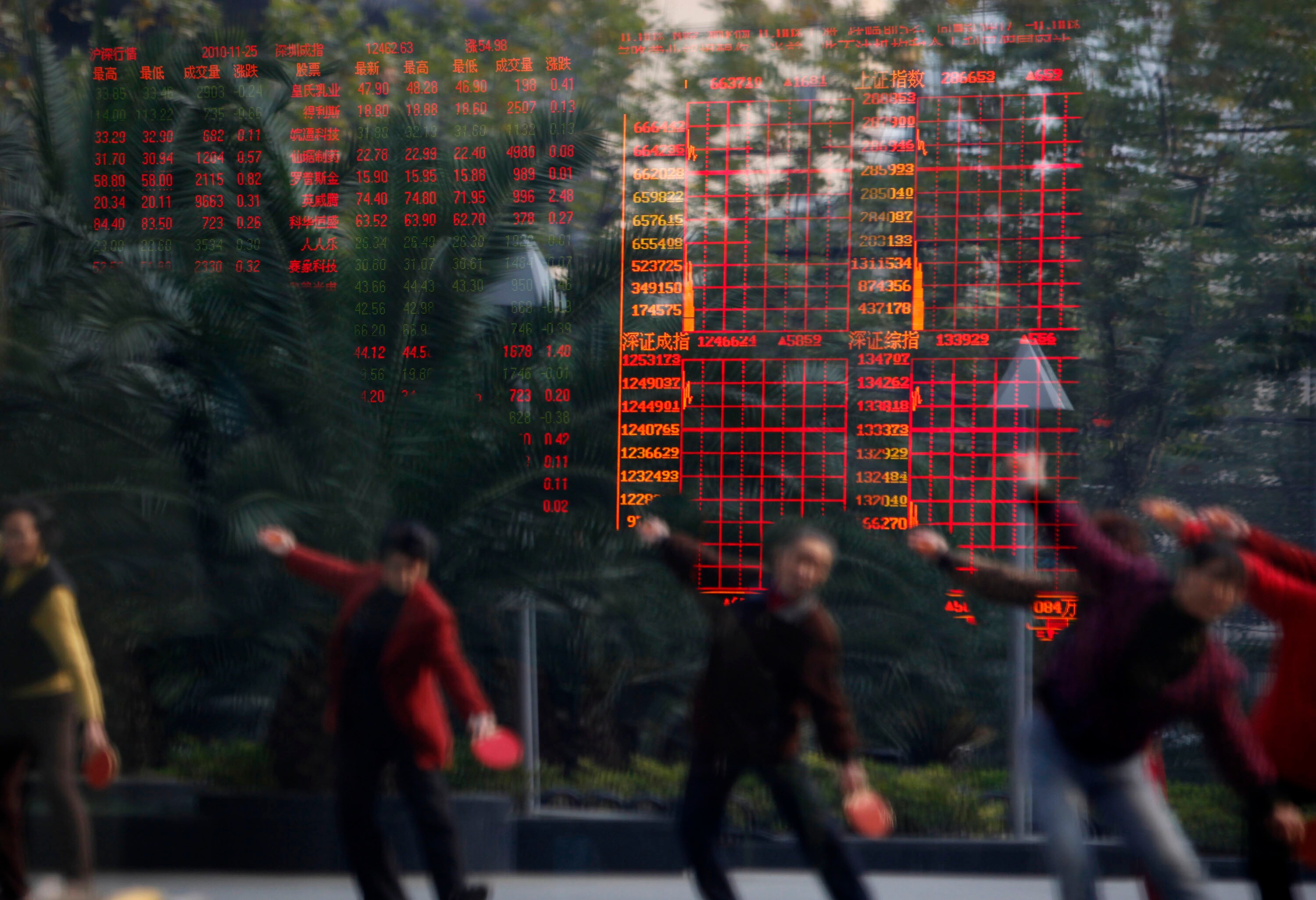 Women exercising are reflected in a window at a securities exchange firm in Shanghai, China. (Photographer: Qilai Shen/Bloomberg)