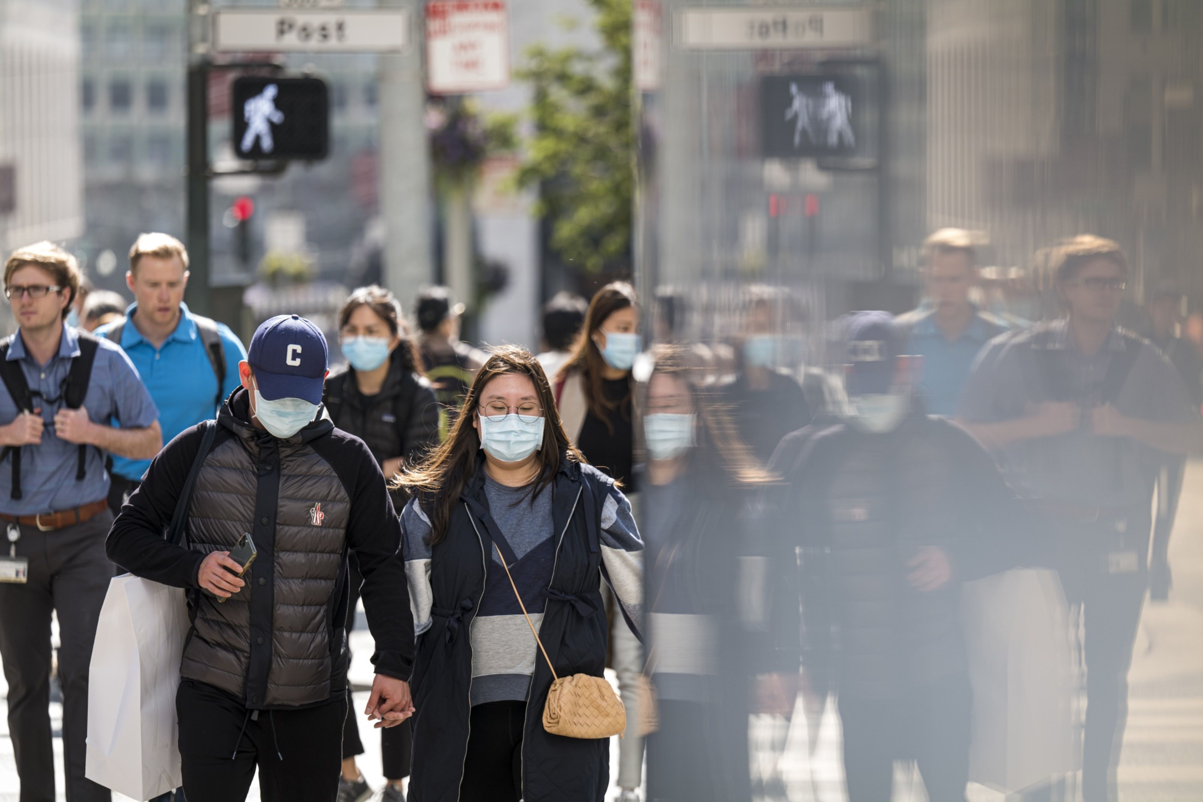Pedestrians wearing protective masks walk past a store in San Francisco, U.S. (Photographer: David Paul Morris/Bloomberg)