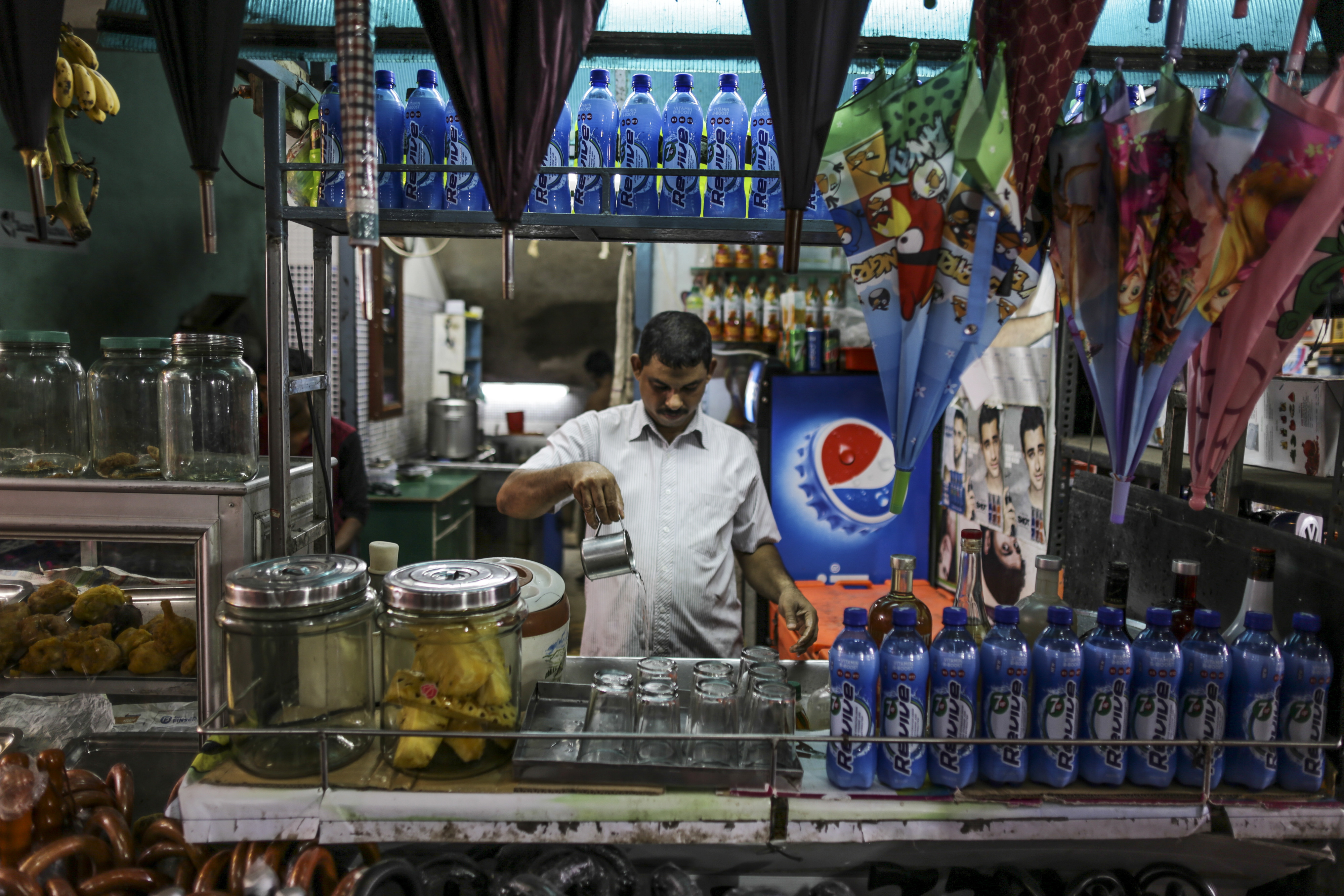 A vendor pours water at a tea stall in Cochin, India. (Photographer Dhiraj Singh/Bloomberg)