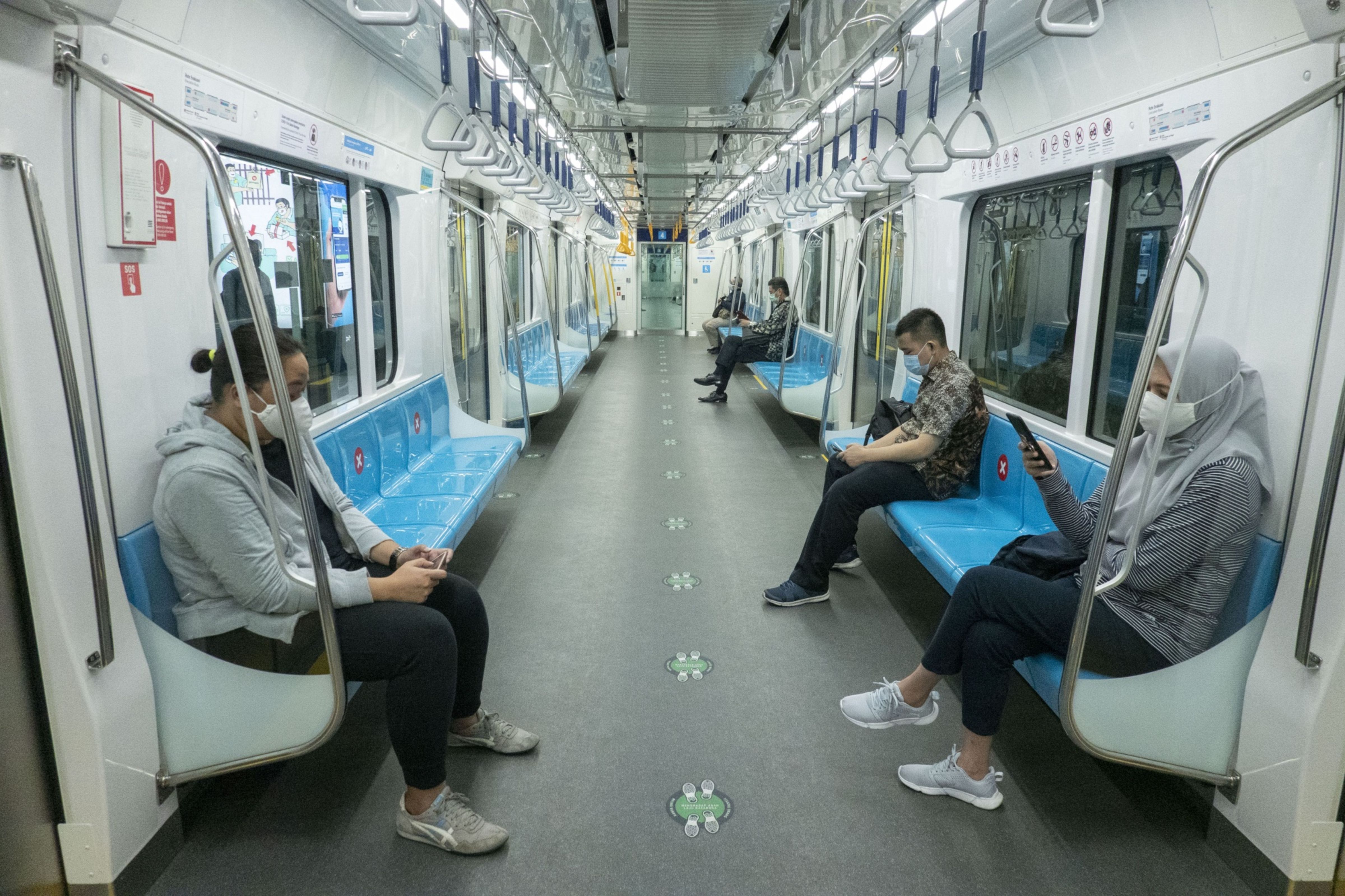 Morning commuters wearing protective masks ride a Jakarta Mass Rapid Transit (MRT) train during a partial lockdown due to the coronavirus in Jakarta, Indonesia. (Photographer: Rony Zakaria/Bloomberg)