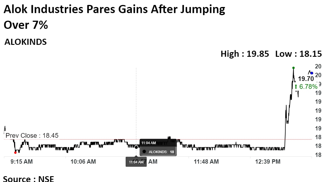 Alok Industries' stock rose as much as 7.86% during the day to Rs 19.9 apiece, the highest since Oct. 20. It pared gains to trade 6.78% higher at Rs 19.7 apiece compared to a 0.22% decline in the benchmark NSE Nifty 50 at 1.36 p.m.