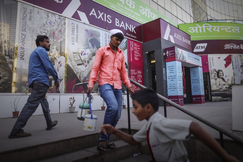 Pedestrians walk by an Axis Bank Ltd. branch in Mumbai, India, on Thursday, Jan. 16, 2014. (Photographer: Dhiraj Singh/Bloomberg.)