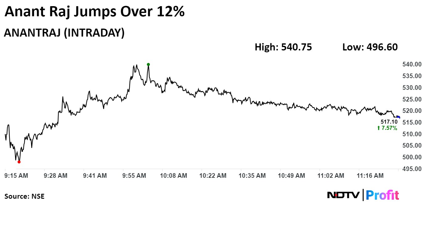 On the NSE, Anant Raj's stock jumped as much as 12.49% during the day to Rs 540.75 apiece, the highest since July 9. It was trading 8.44% higher at Rs 521.10 per share, compared to a 0.03% advance in the benchmark Nifty at 11:21 a.m.