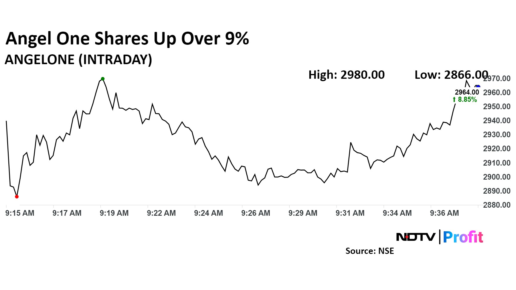 Angel One' share price rose as much as 10.5% during the day before paring gains to trade 9.52% higher at Rs 2,982.40 apiece as of 9:41 a.m., compared to a 0.18% advance in the benchmark Nifty 50.