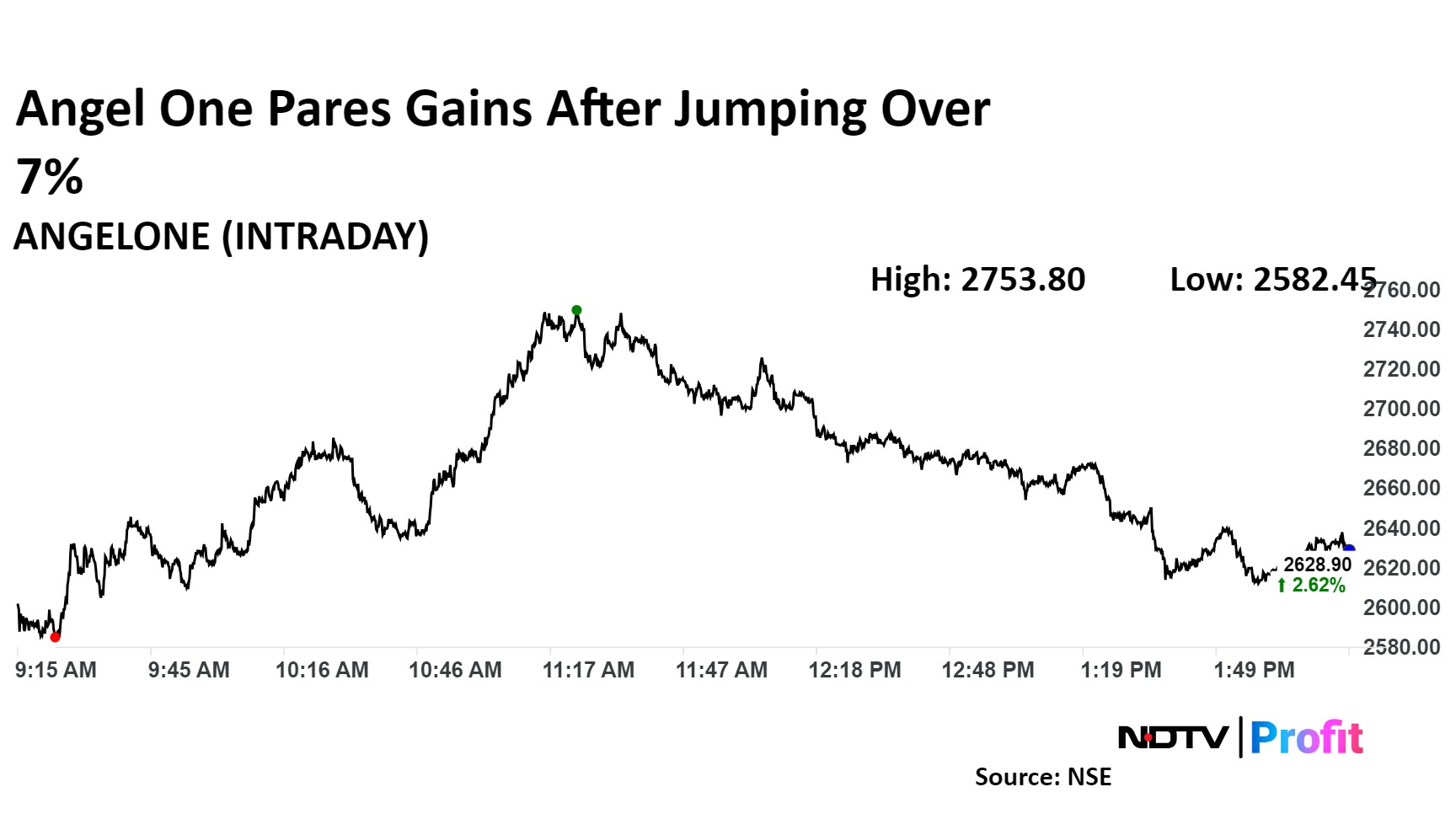 Angle One shares rose as much as 7.5% before paring gains to trade 1.92% higher at Rs 2,611.00 per share as of 2:47 p.m., compared to a 0.17% decline in the NSE Nifty 50.
