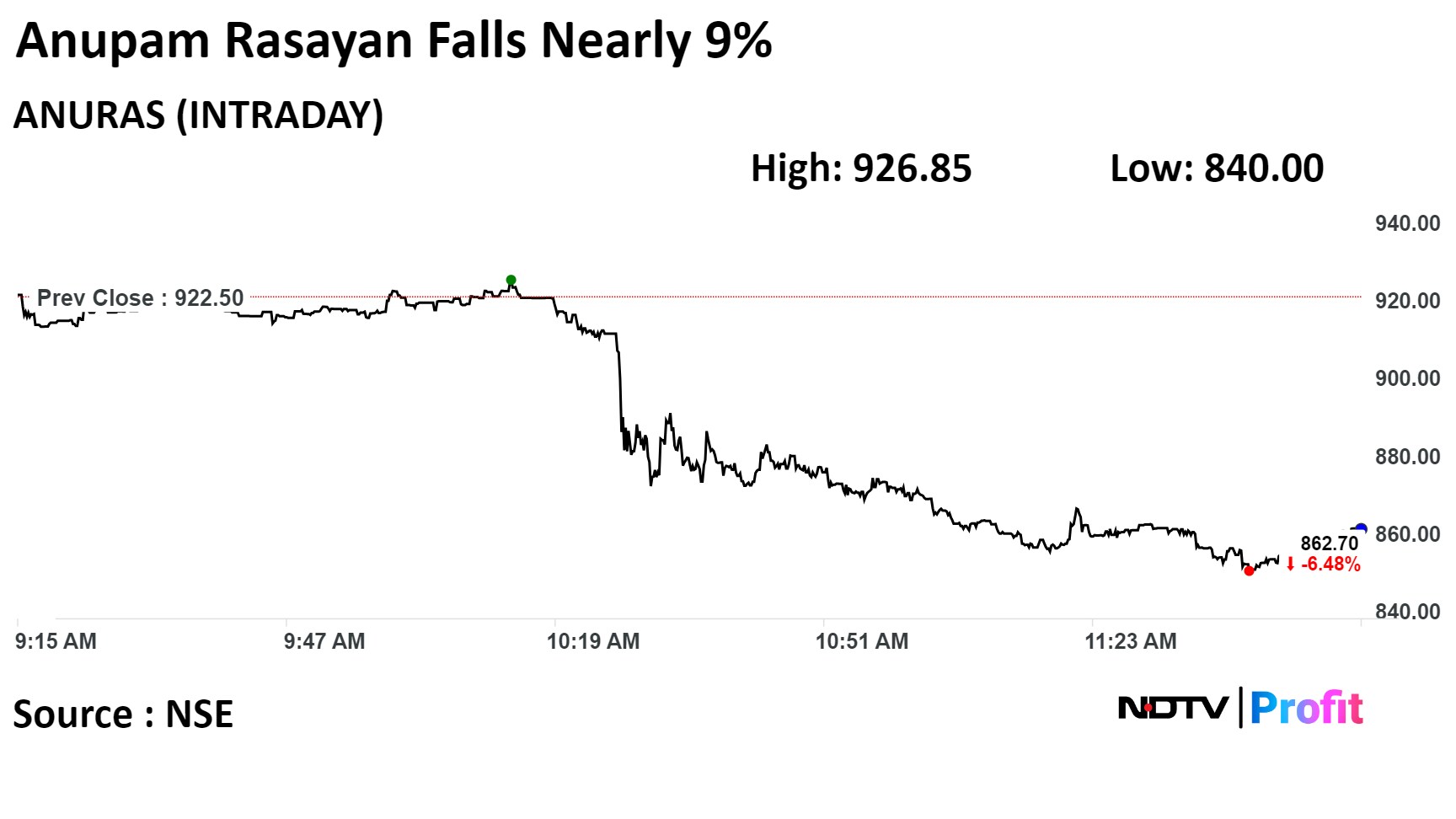 Shares of Anupam Rasayan declined 8.94%, the lowest level since Oct. 26, 2023, before paring loss to trade 7.20% lower at 11:48 a.m. This compares to a 0.44% decline in the NSE Nifty 50.
