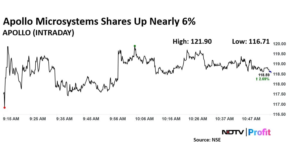 Apollo Micro Systems' stock rose as much as 5.56% during the day to Rs 121.90 apiece on the NSE. It was trading 2.87% higher at Rs 118.80 apiece, compared to a 0.36% advance in the benchmark Nifty 50 as of 10:53 a.m.