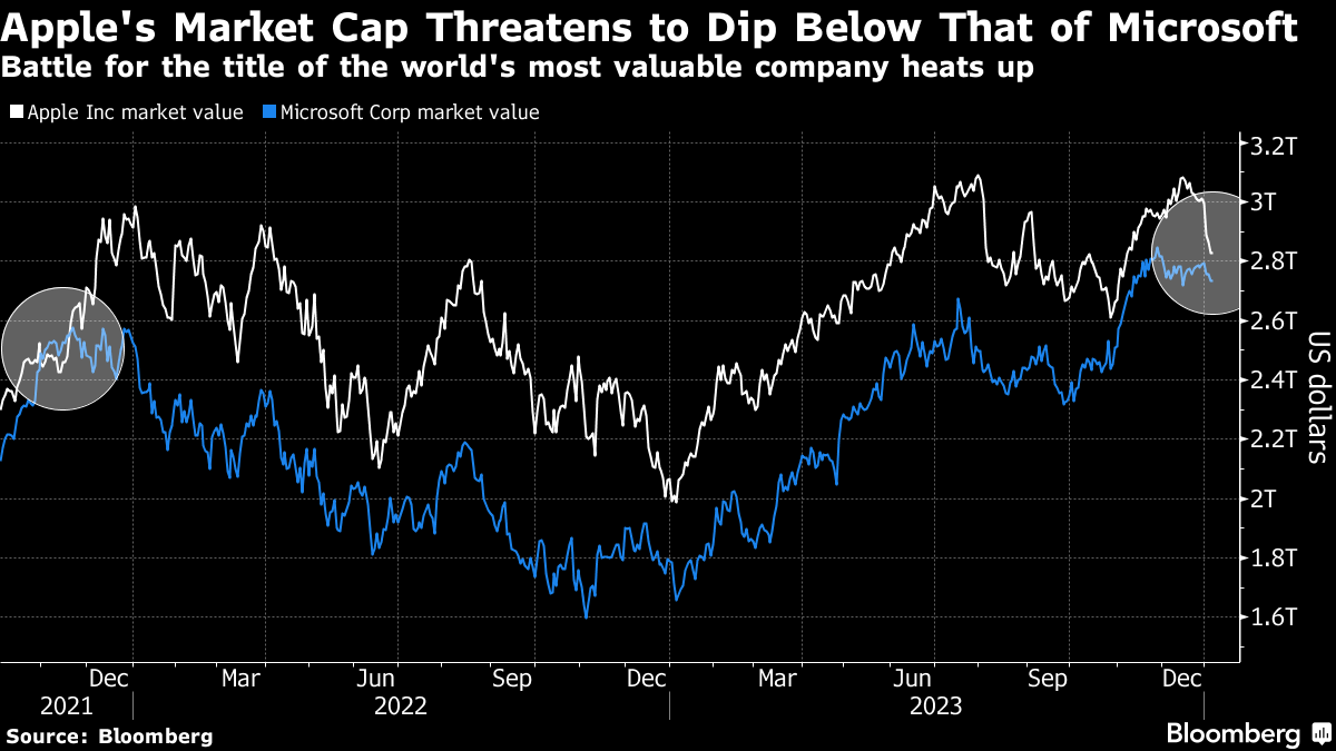 The downturn began earlier in the week after the technology giant was hit by two ratings downgrades, with analysts flagging a weak macro environment in China pressuring demand for iPhones. That has shrunk its lead over fellow technology juggernaut Microsoft Corp. — whose shares have seen a less pronounced decline to begin the year — to less than $100 billion.