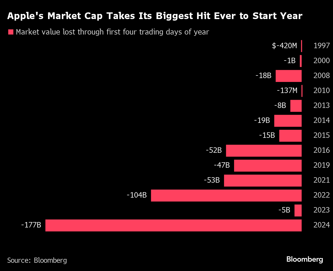 The Cupertino, California-based company has been the most valuable publicly-listed company since July 2022, but has seen about $177 billion in market value erased so far this year, according to data compiled by Bloomberg. While the stock has suffered bigger percentage declines in the first week of January, the losses are the biggest market value destruction at the start of any year on record.