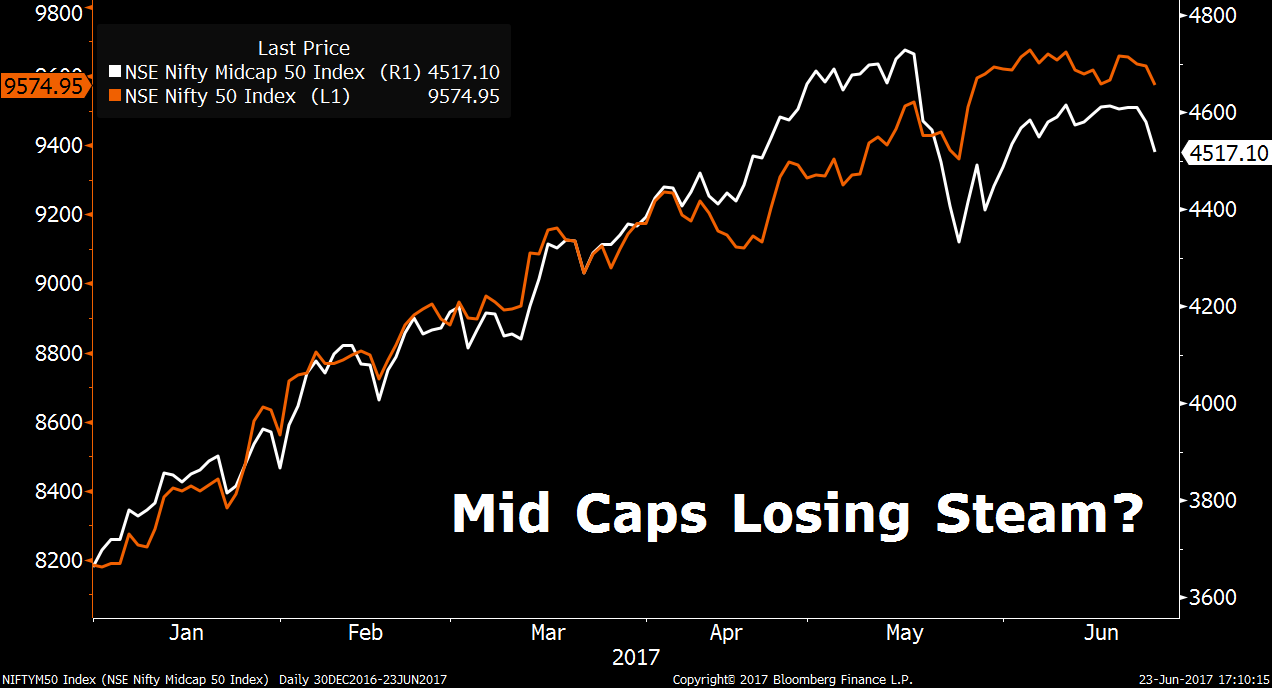 “Mid-caps have been running up on hopes of earnings recovery. The recovery may be pushed down to third or fourth quarter courtesy the GST rollout,” he told BloombergQuint over the phone.
