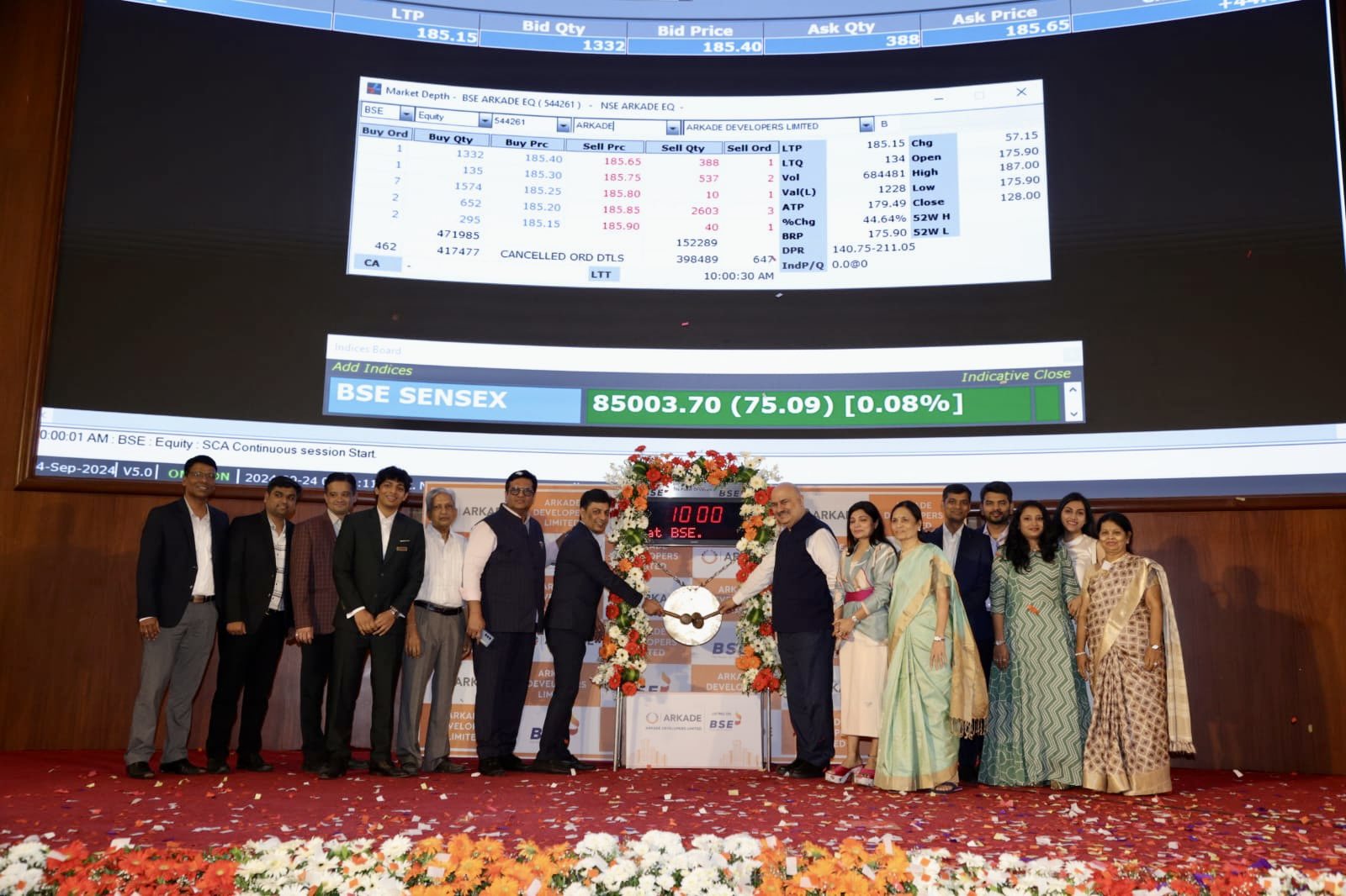 Shares of Arkade Developers Ltd. ended on the BSE on Tuesday at Rs 165.5 apiece, a premium of 29.3% over its issue price of Rs 128 per share. On the National Stock Exchange, the stock closed at Rs 165.45 per share, marking a premium of 29.2%.