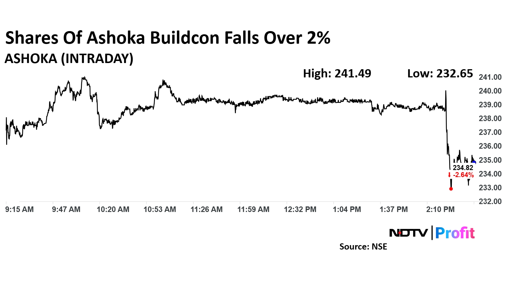 Ashoka Buildcon's stock declined as much as 3.54% to Rs 232.65 apiece on the NSE. It pared losses to trade 2.56% lower at Rs 235, as of 2:45 p.m. This compared to a 0.39% advance in the NSE Nifty 50 Index.