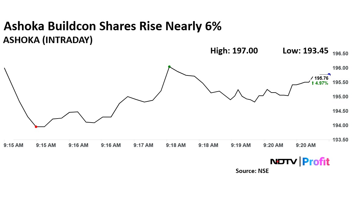 The shares of Ashoka Buildcon rose as much as 5.64% to Rs 197 apiece, the highest level since April 4. It pared gains to trade 4.82% lower at Rs 195.44 apiece, as of 9:19 a.m. This compares to a 2% advance in the NSE Nifty 50 Index.