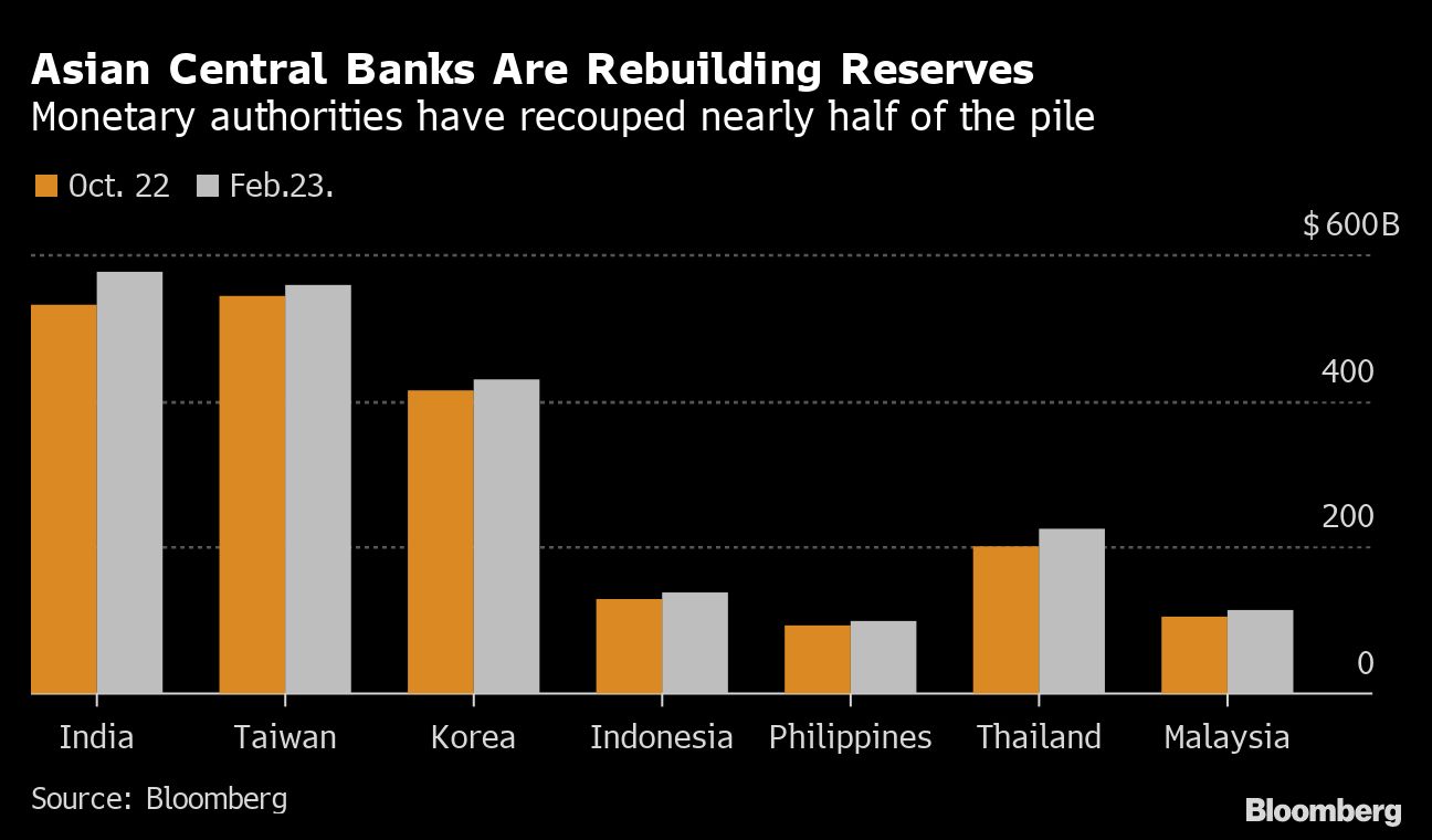 These countries saw their foreign reserves drop by $243 billion in the first 10 months of 2022 as they sought to defend currencies that plunged against the dollar. Rebuilding their stockpiles may help Asia's emerging markets withstand any potential rebound in the greenback, as some traders start pricing in higher US peak rates, which would hit demand for risk assets.